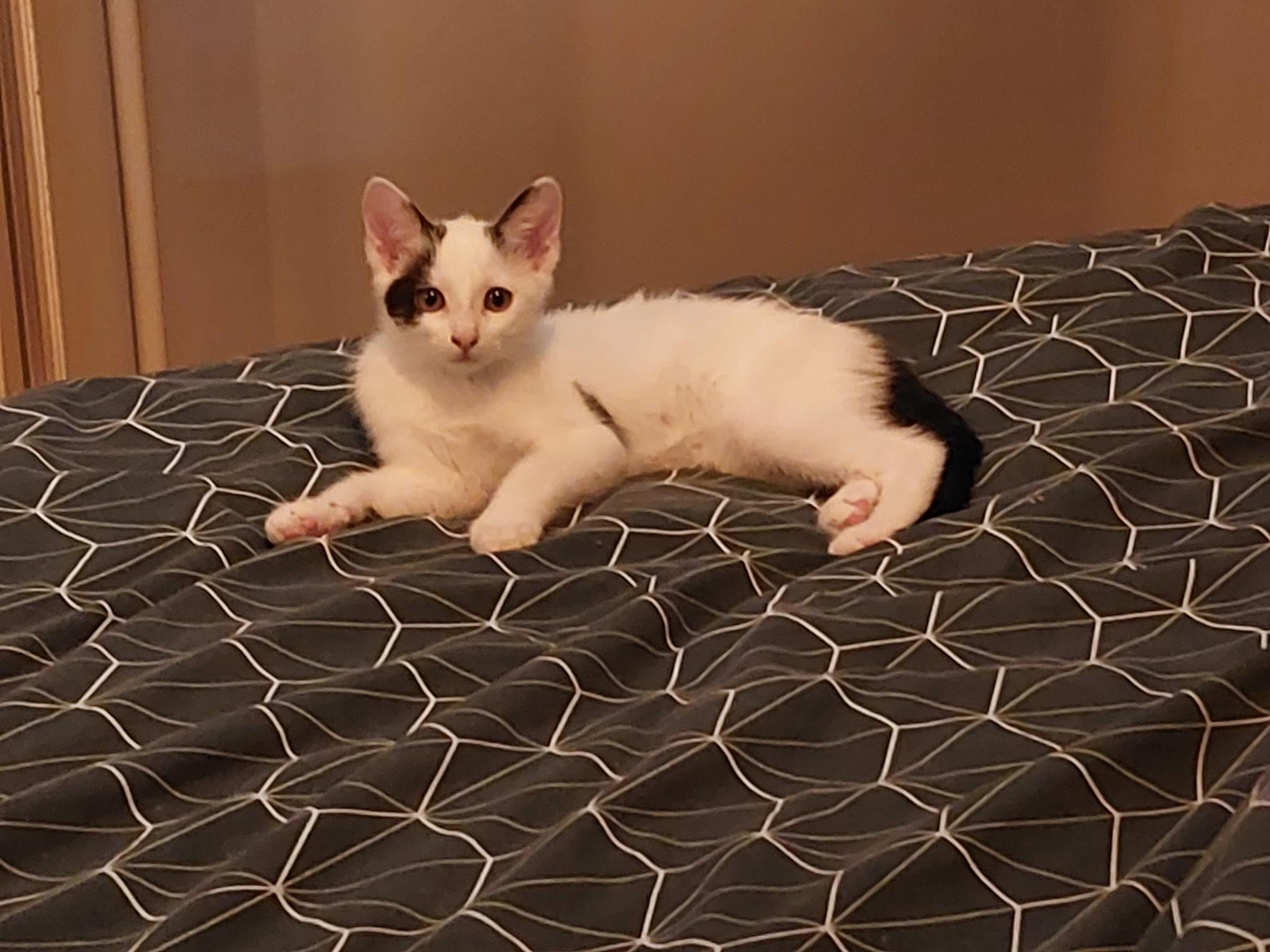 Canaille est un beau mâle blanc et tigré d’environ 6 mois.
