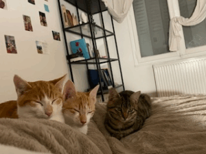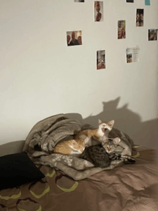 J’adore le calme de la nuit et la chaleur de mes humains et je profite de ses moments là pour être câlin et m’habituer à tout le monde.