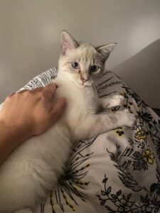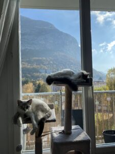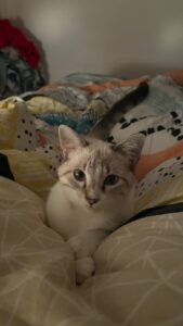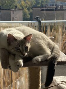 Il est encore très peureux lorsque l’on est debout, mais une fois couché, il adore venir se lover contre nous sur la couette en ronronnant.