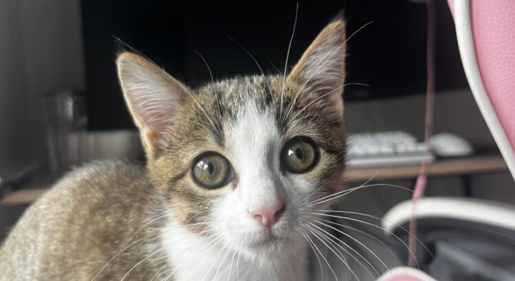 Bloom est une adorable femelle tigrée blanche, marron et noire, née en juillet 2025.