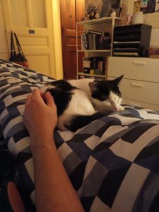 Elle adore explorer, découvrir, et finira par se blottir contre vous pour chercher des câlins et se transformer en machine à ronrons. Ses passes-temps favoris sont : jouer avec les chaussures, jouer avec des petites balles, jouer avec des bâtons, manger un petit peu et enfin retourner jouer avec ses humains sur le lit.