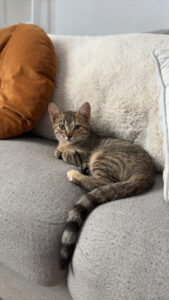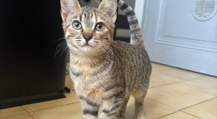 Mélie est une adorable chatonne tigrée, affectueuse, câline et pleine d’énergie.