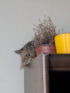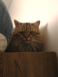Petite chatte recueillie mi-novembre avec ses chatons, Miel est vraiment toute timide, mais particulièrement attachante. Elle ne fait preuve d’aucune agressivité mais reste assez réticente au contact, même si sa peur semble se dissiper petit à petit. Progressivement, nous arrivons à lui donner des friandises et à la caresser un peu. Elle sait manifester qu’elle en a marre calmement, la plupart du temps simplement en se reculant. Pour le moment, elle reste la majeure partie du temps cachée en haut d’un placard et nous regarde avec beaucoup de curiosité. Elle sort souvent en notre absence manger et faire ses besoins. C’est une chatte très propre avec qui nous n’avons jamais eu aucun accident. Même si nous remarquons des progrès de sa part, Miel aura besoin de temps pour s’adapter et faire confiance.