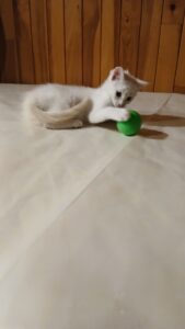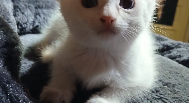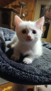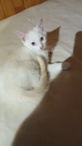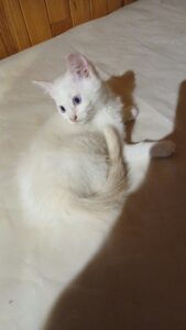 Ninja est une chatonne blanche aux yeux bleus (typé siamoise), avec la queue et les oreilles orangées né le 01/09/2025.