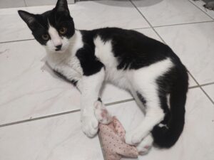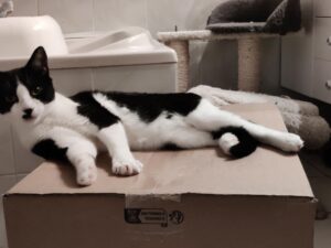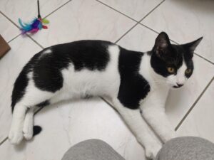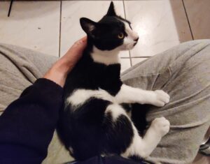 Au début de sa sociabilisation, il est resté caché 3 semaines et ne sortez que quand il n’avait personne. Puis, d’un coup, il s’est laissé caresser et il a tout de suite apprécié et fait des grands ronrons. Puis un jour il est venu dormir sur mes genoux et maintenaient il se laisse même un peu se prendre dans les bras. Avec un peu de temps il dormirait dans le lit ! Il ne mord pas et griffe très peu quand il joue.
