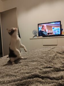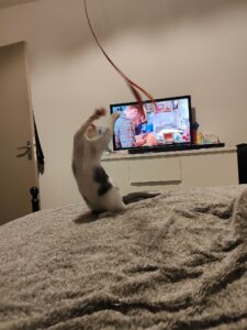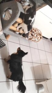 Il aime jouer avec ses deux copains chihuahua, un rien l’amuse, il ne cherche pas à sortir, mais aime beaucoup regarder par la fenêtre.