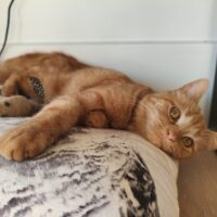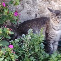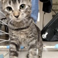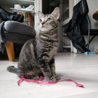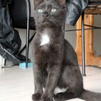 Pouka est le gris tigré, c’est le goinfre qui ne dira jamais non à la pâtée. Il est aussi aventureux et aimé être gratouillé.