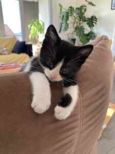 Il est aussi très joueur. Grand fan du jeu du bouchon pendu au bout d’une ficelle, il peut y jouer longtemps. La seule chose qui l’arrête, c’est sa sœur qui passe. Auquel cas il lui saute dessus pour une gentille bagarre.
