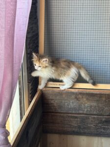 Saori est un chaton femelle tricolore angora née approximativement le 28/08/25 et arrivée avec son frère et ses 3 sœurs.