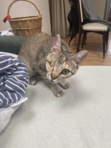 Sarabi est stérilisée et totalement vaccinée typhus coryza. Elle n’a qu’un seul oeil suite à une grave infection aujourd’hui complétement cicatrisé