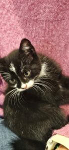 Chaton noir et blanc de 3 mois et demi facilement reconnaissable à ses grandes moustaches blanches qui lui donnent l’air d’un petit papi. C’est un petit chat câlin toujours en attente d’attention et qui ronronne dès la 1ere caresse. Il est joueur et toujours dans les 1ers à accourir pour le jeu, la pâté ou les caresses.