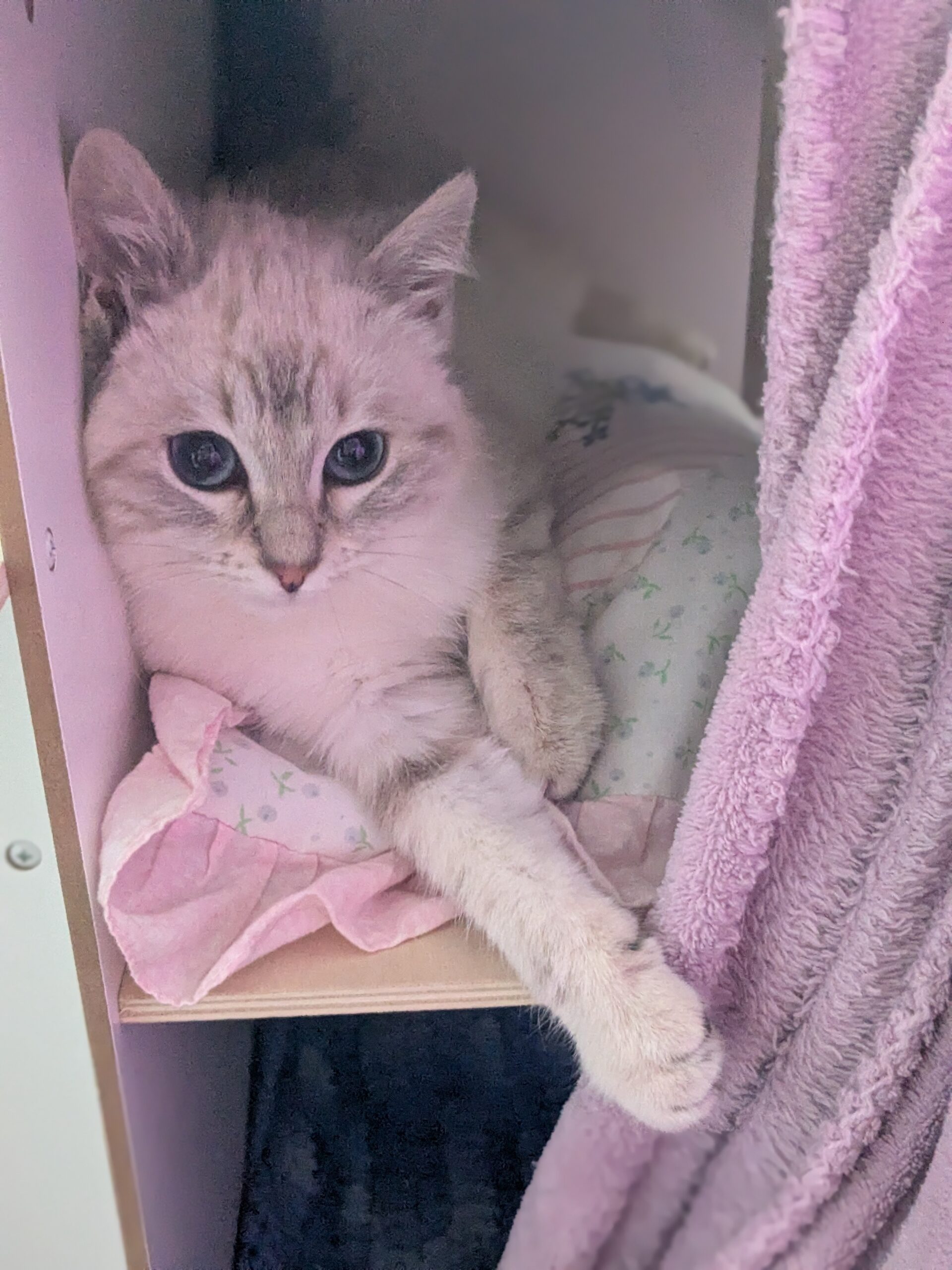 Snow a été recueilli courant décembre 2025 par une personne qui ne pouvait pas la garder. On ne sait rien sur elle excepté qu’elle est déjà très sociable.