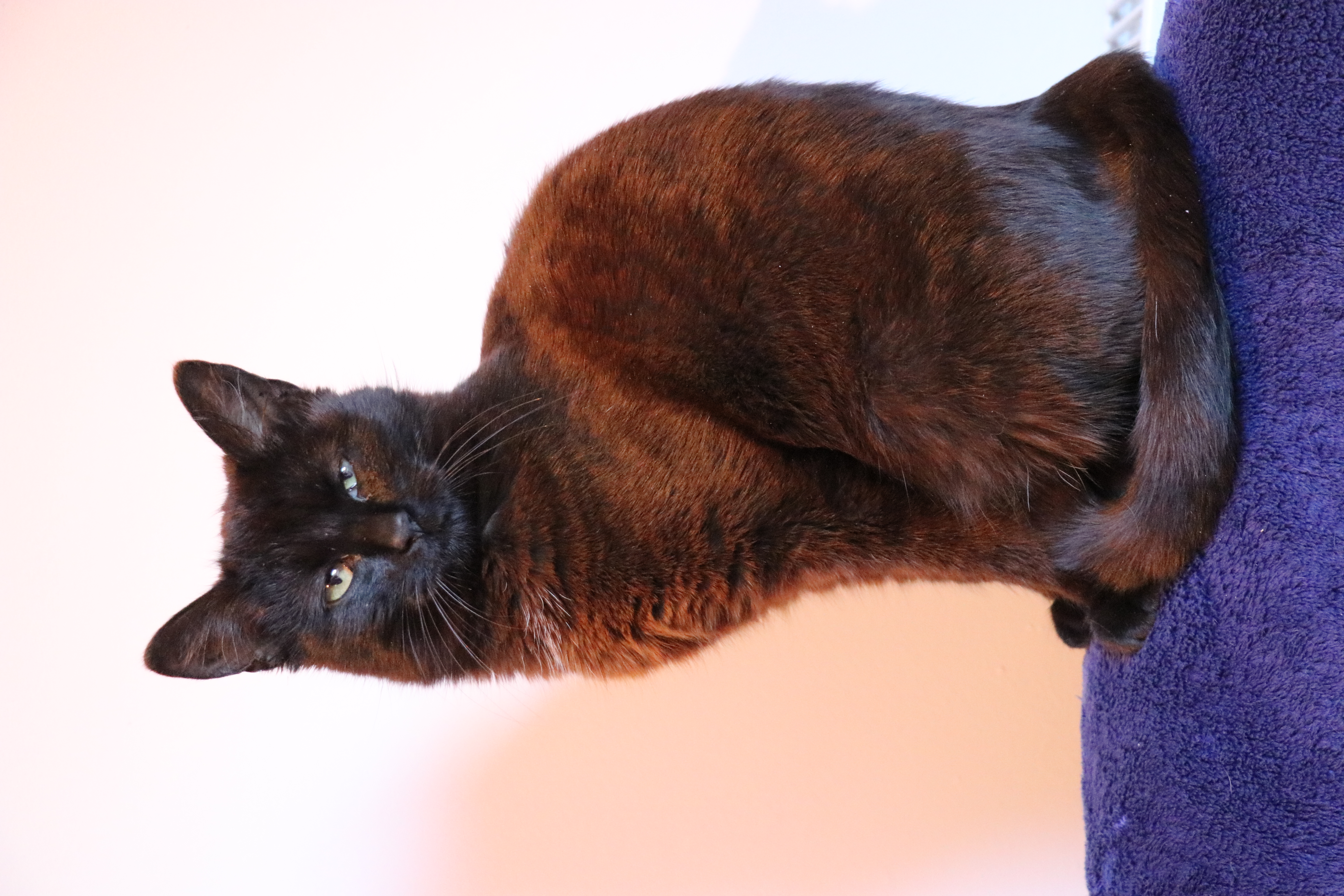 Elle est assez calme, contrairement à pas mal de chats ce n’est pas une « grimpeuse » (en tout cas pour l’instant !).
