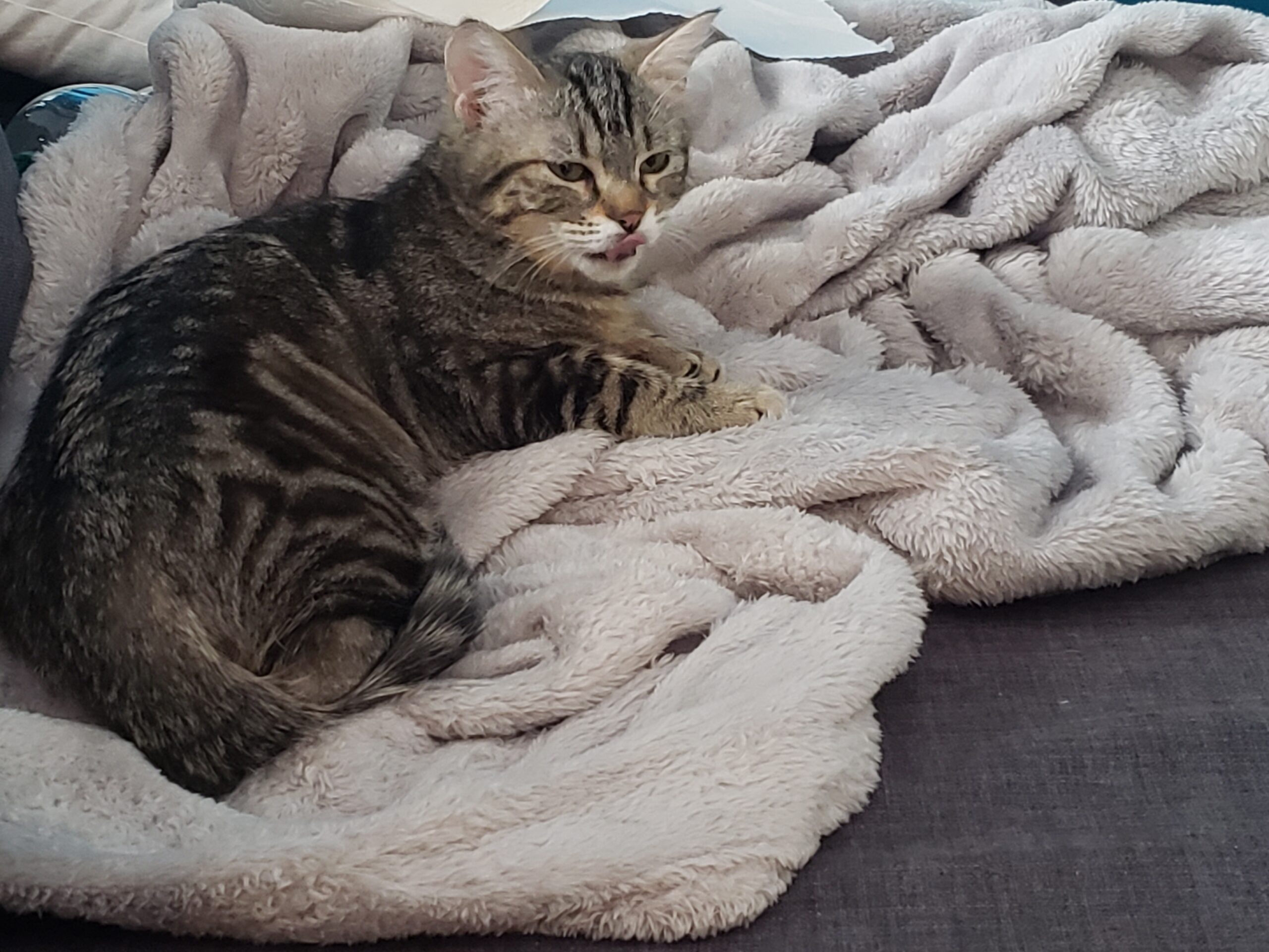 Il a depuis été adopté et mène une vie de câlins et de bonheur avec un copain chat et sa famille d’adoption.