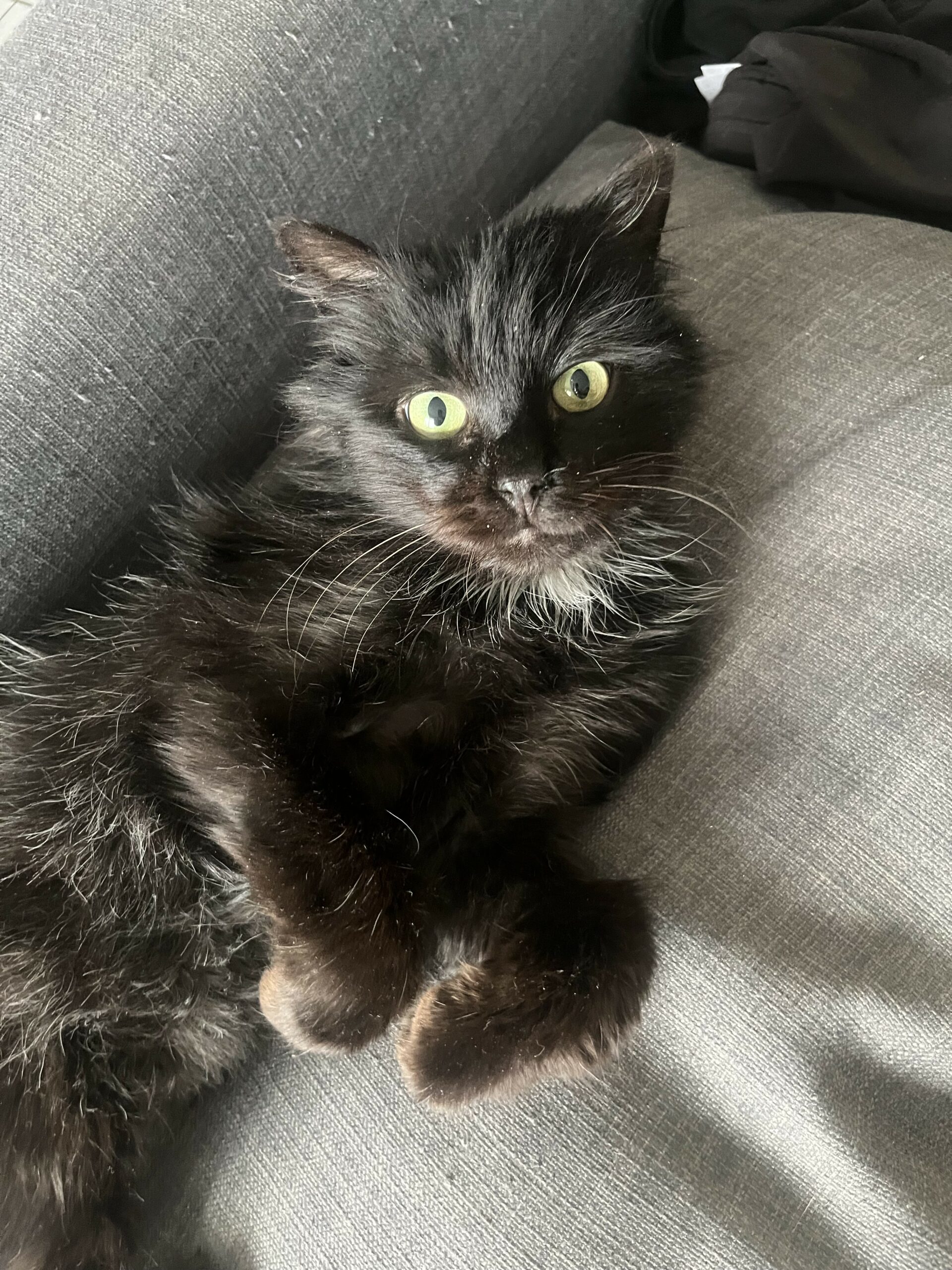 Elle est très câline et elle ronronne beaucoup. Elle est aussi très gourmande c’est la première pour terminer vos pots de yaourt et s’en mettre plein la truffe jusqu’aux oreilles.  Elle vient toujours se réchauffer dans les bras de ses humains.