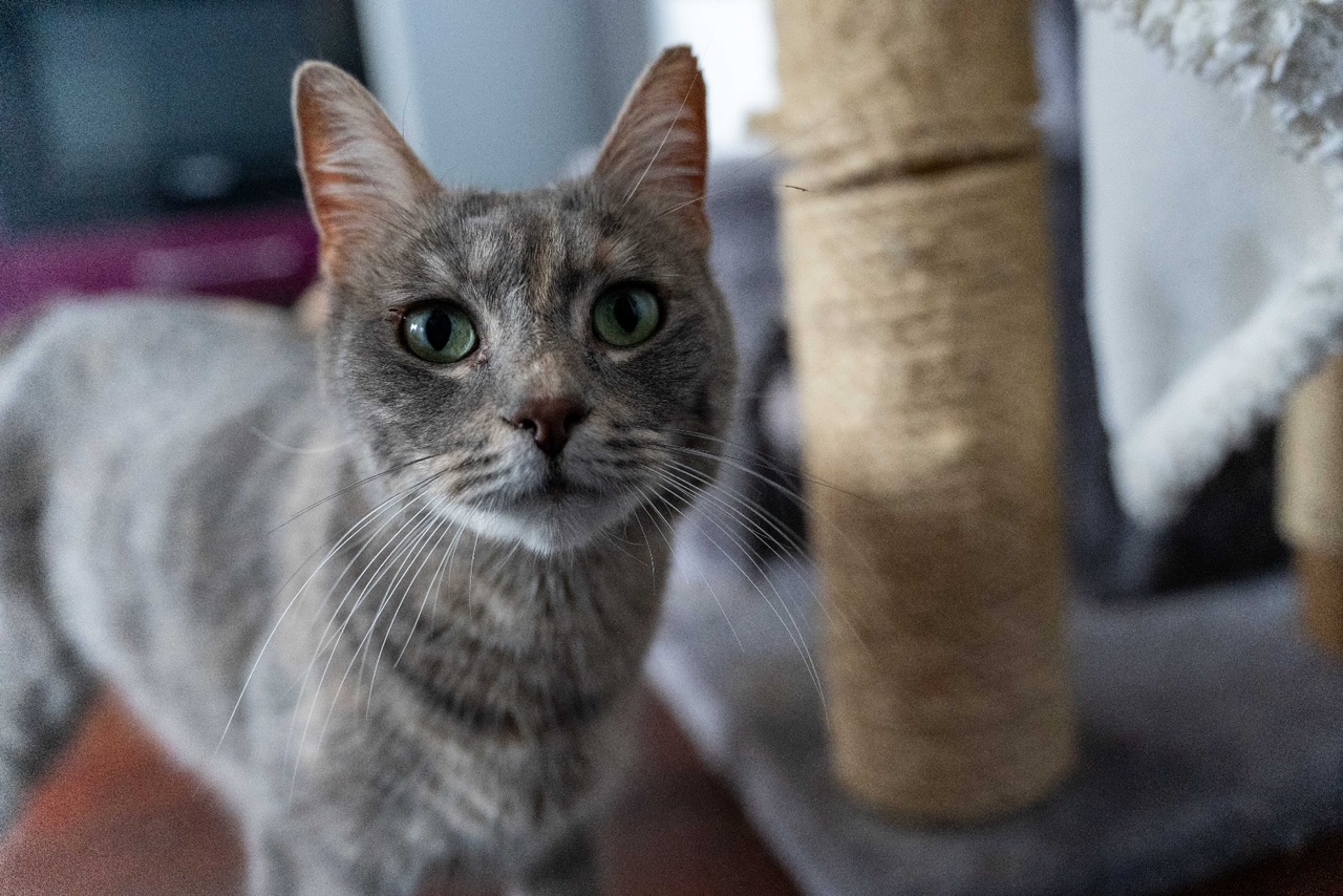 Après une petite semaine « choc » assez stressante pour elle et sa sœur pour s’habituer à la vie en intérieur et au contact répété avec les humains, Nuage a pris confiance en l’homme (et en la vie en appartement !).
