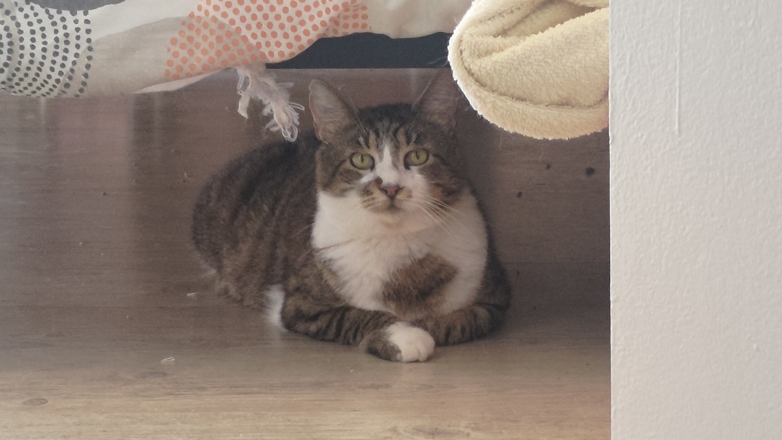 Maintenant qu’elle a confiance, c’est un amour, elle ronronne et vient chercher les câlins.  Par contre  se méfier, quand on lui donne sa pâtée, ayant sûrement endurée la faim, on peut se prendre quelques coup de pâte.  C’est  pour ça  que je conseille d’éviter les enfants en bas âge.