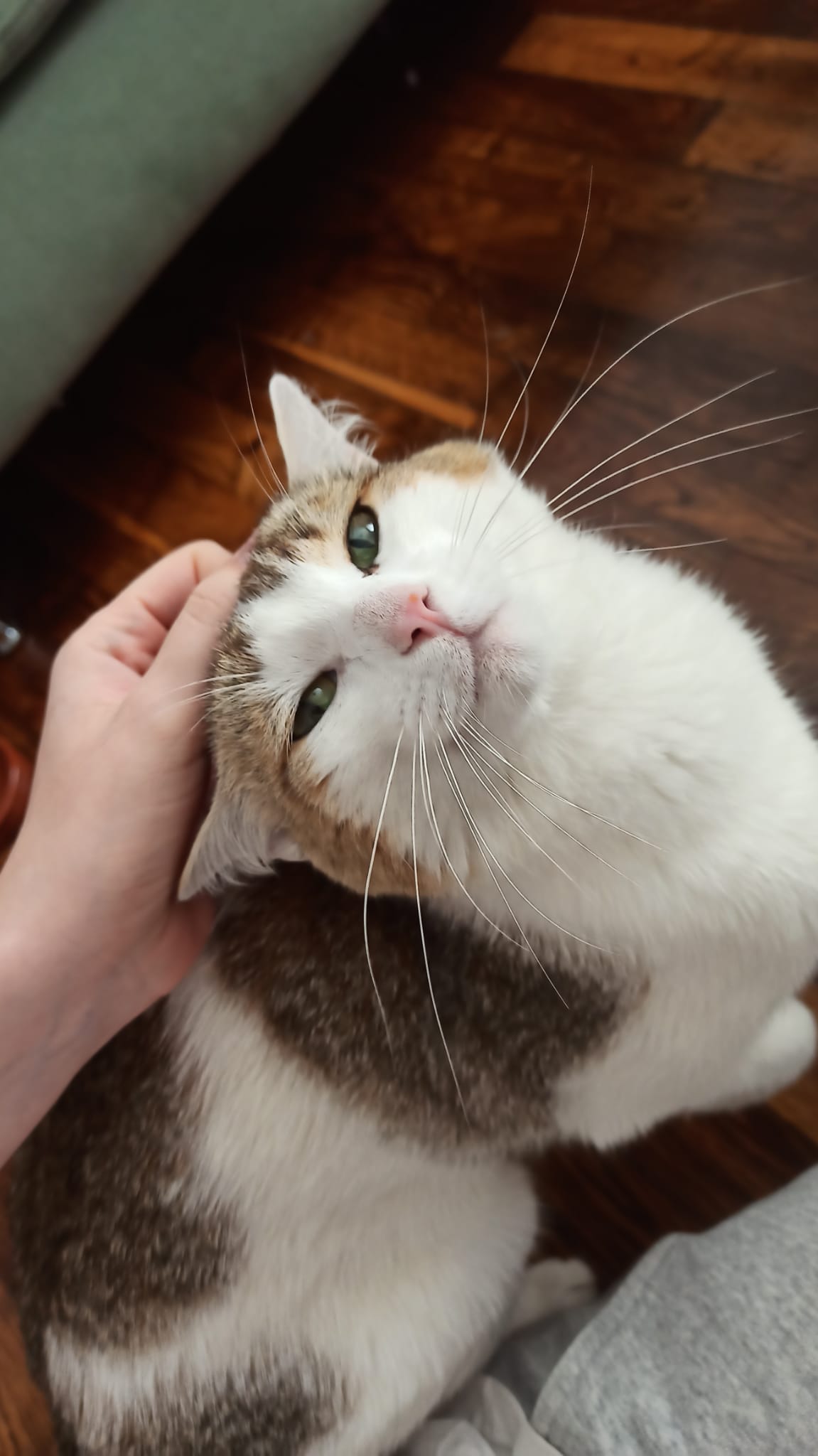 Elle est très câline et elle ronronne beaucoup. Elle est aussi très gourmande c’est la première pour terminer vos pots de yaourt et s’en mettre plein la truffe jusqu’aux oreilles.  Elle vient toujours se réchauffer dans les bras de ses humains.