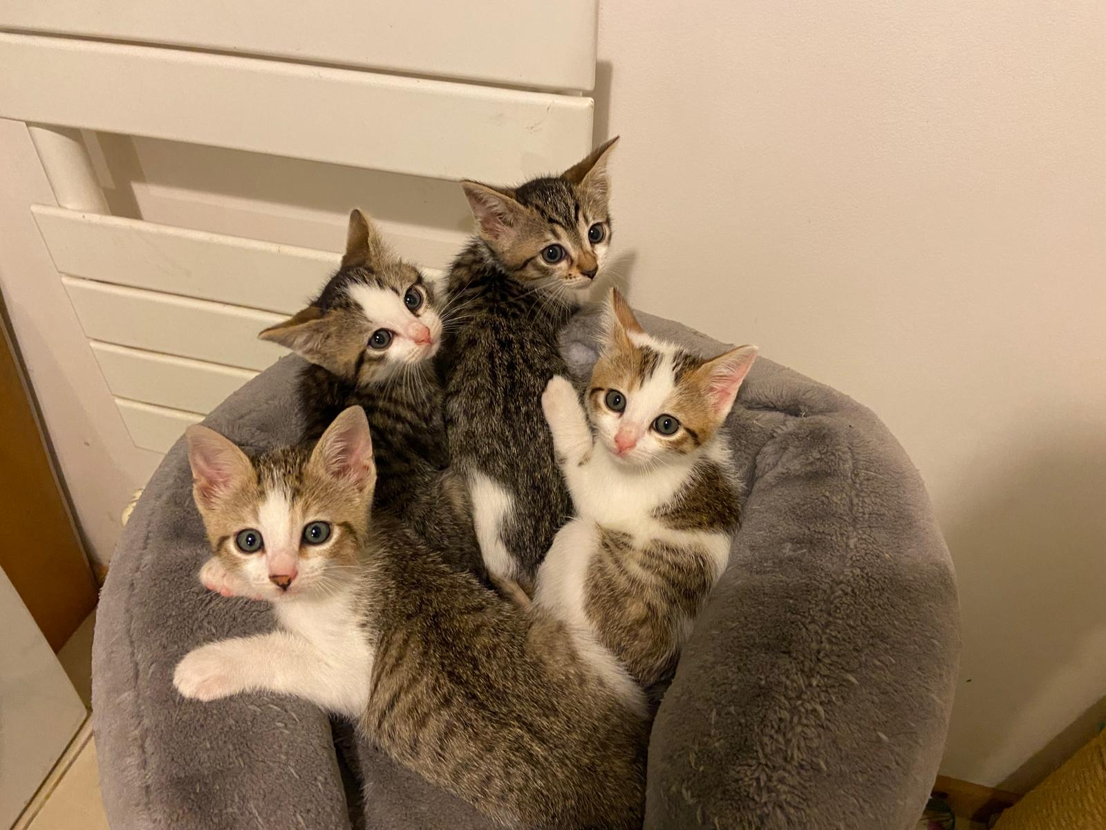 Nous soupçonnons un abandon: aucune trace de la mère et les chatons étaient seuls depuis de nombreuses heures, en hypothermie, affamés, et souffrant de coryza.