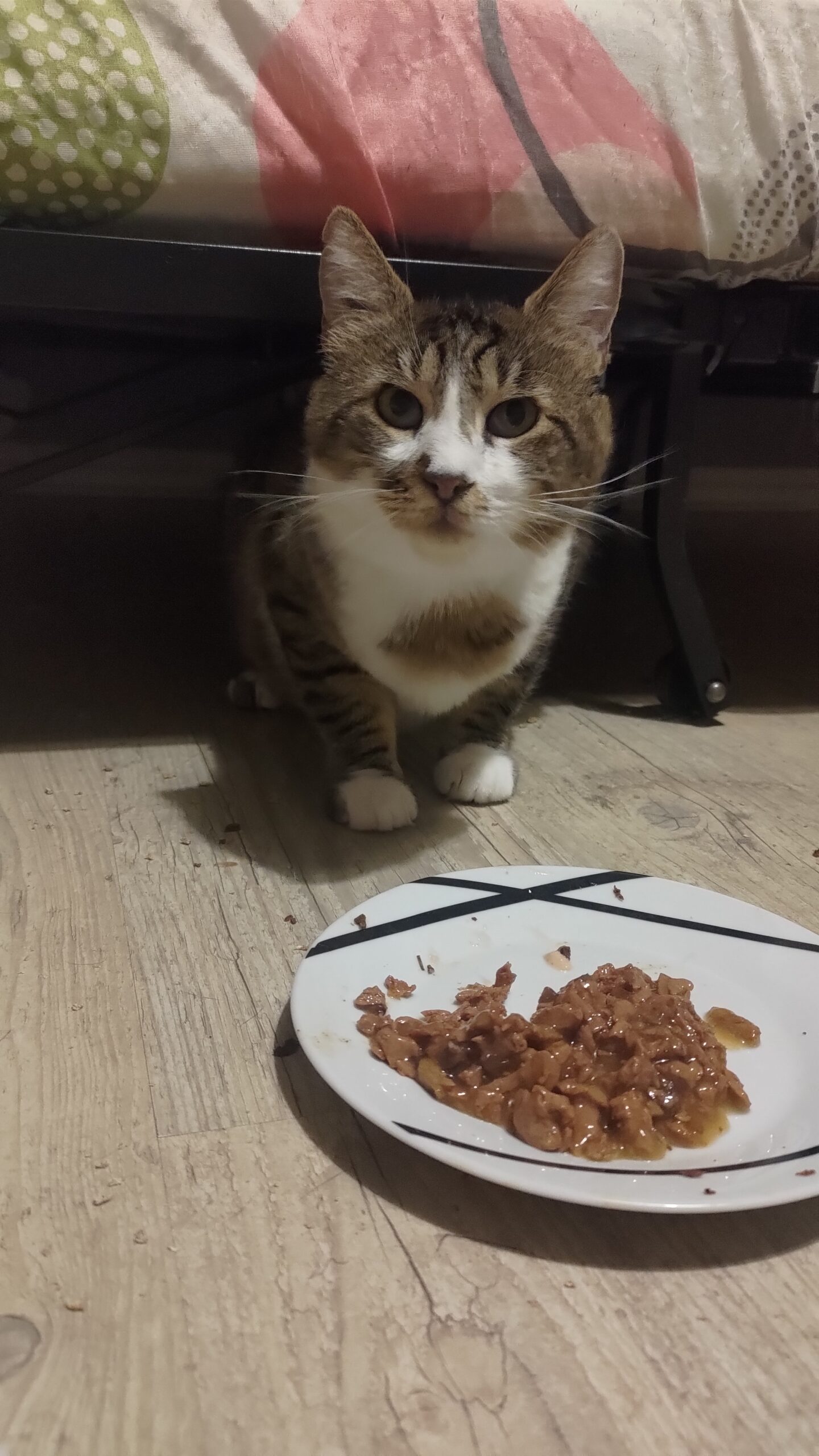 Maintenant qu’elle a confiance, c’est un amour, elle ronronne et vient chercher les câlins.  Par contre  se méfier, quand on lui donne sa pâtée, ayant sûrement endurée la faim, on peut se prendre quelques coup de pâte.  C’est  pour ça  que je conseille d’éviter les enfants en bas âge.
