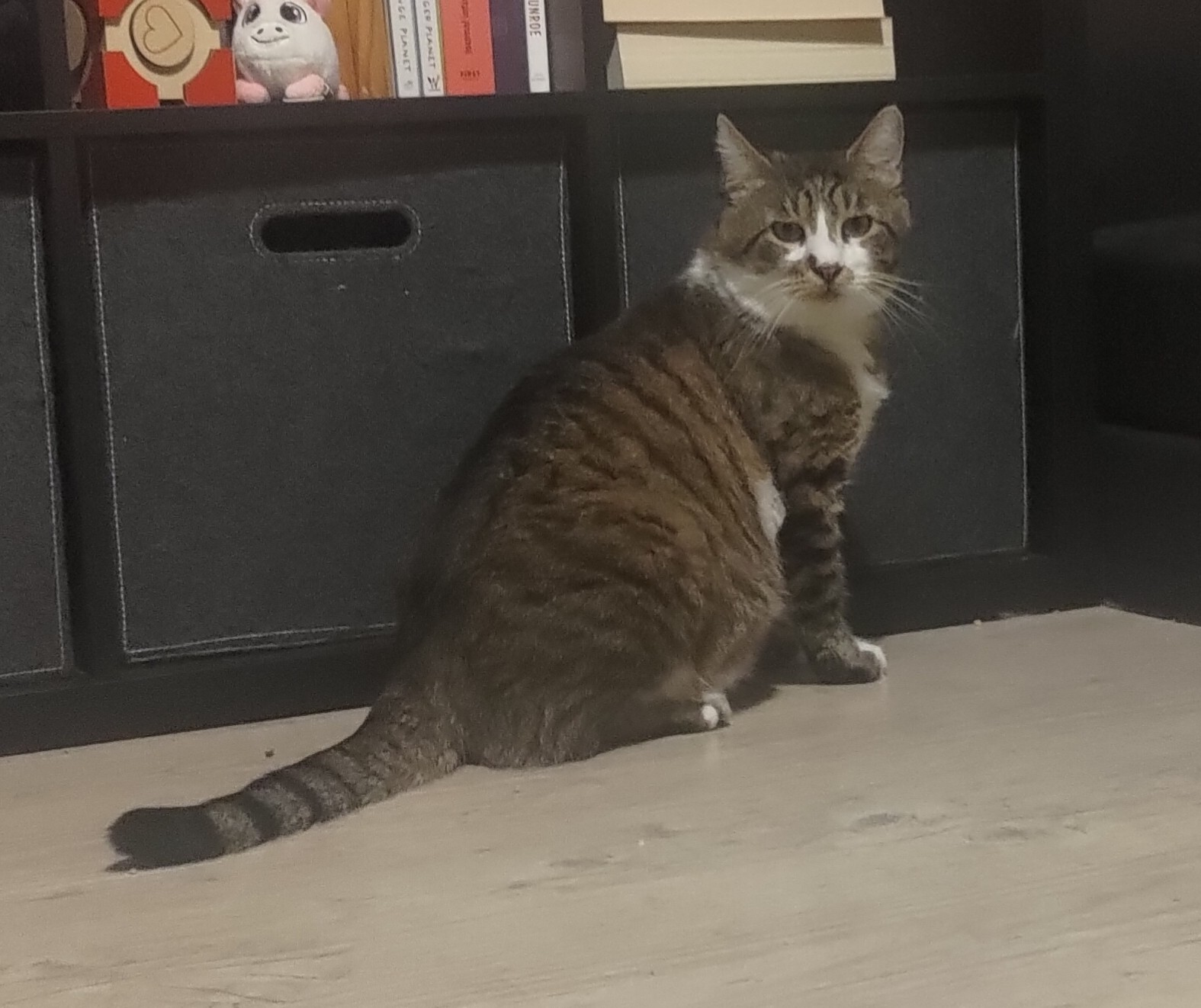 Elle est pour l’instant encore un peu craintive, mais se laisse régulièrement caresser et au passage apprécie me léchouiller les mains (et les pieds !).