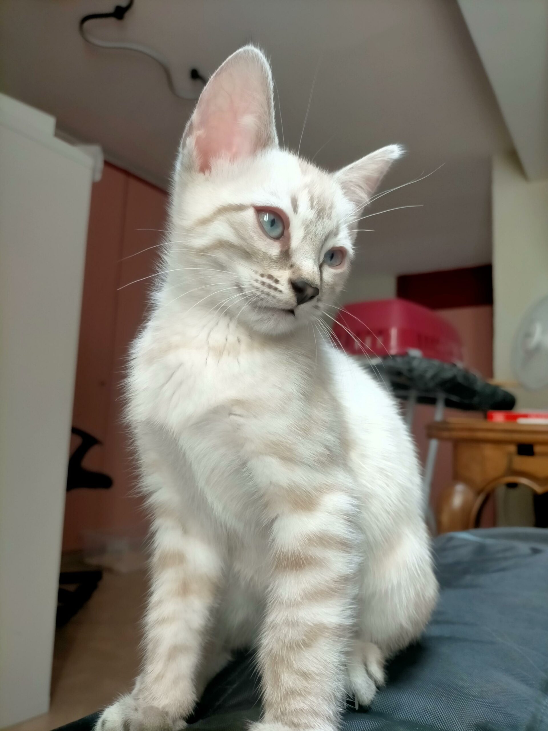 Je vous présente la petite Aimé, une adorable femelle de 4 mois et demi. Elle est très curieuse et n’a peur de rien ! Elle passe la plus grande partie de ses journées à jouer, et quand elle ne joue pas elle s’autorise des petites siestes.