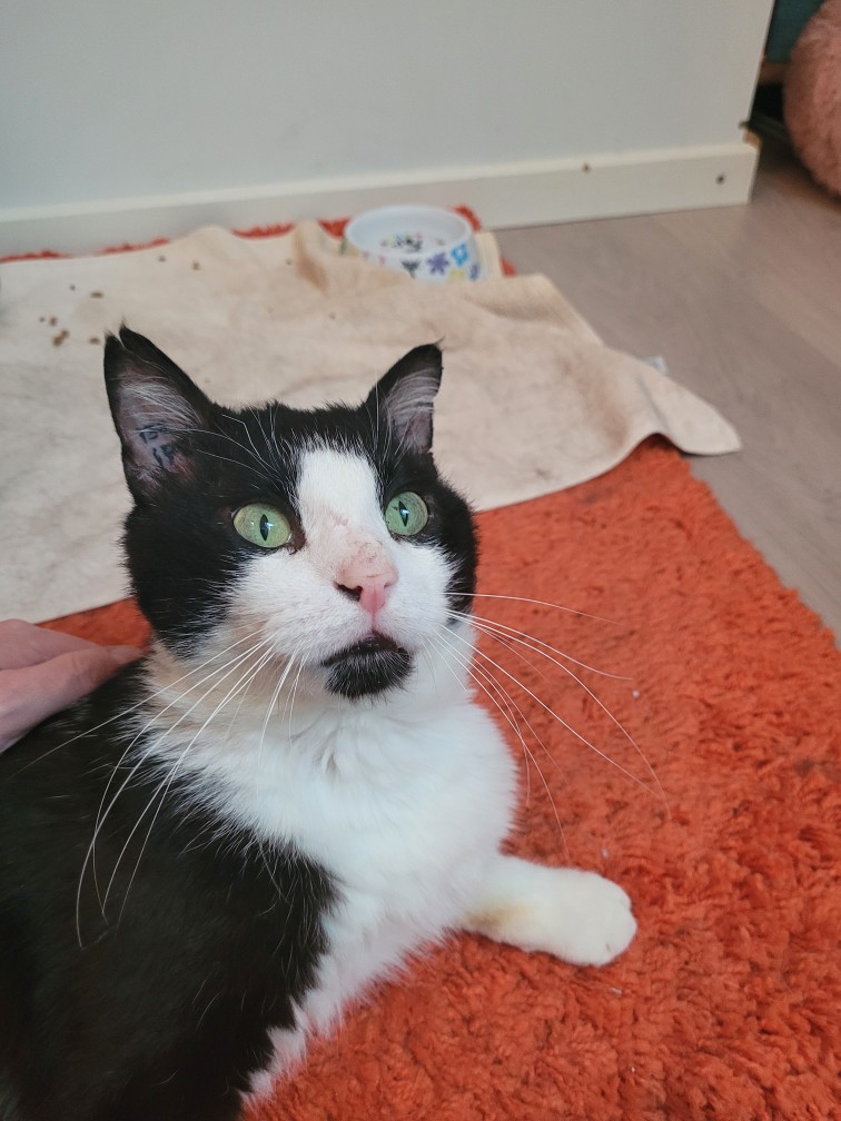 Maintenant qu’elle a confiance, c’est un amour, elle ronronne et vient chercher les câlins.  Par contre  se méfier, quand on lui donne sa pâtée, ayant sûrement endurée la faim, on peut se prendre quelques coup de pâte.  C’est  pour ça  que je conseille d’éviter les enfants en bas âge.