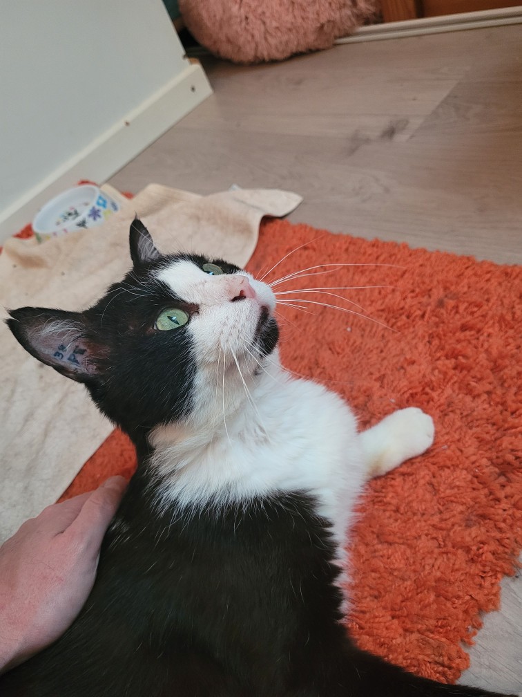 Maintenant qu’elle a confiance, c’est un amour, elle ronronne et vient chercher les câlins.  Par contre  se méfier, quand on lui donne sa pâtée, ayant sûrement endurée la faim, on peut se prendre quelques coup de pâte.  C’est  pour ça  que je conseille d’éviter les enfants en bas âge.