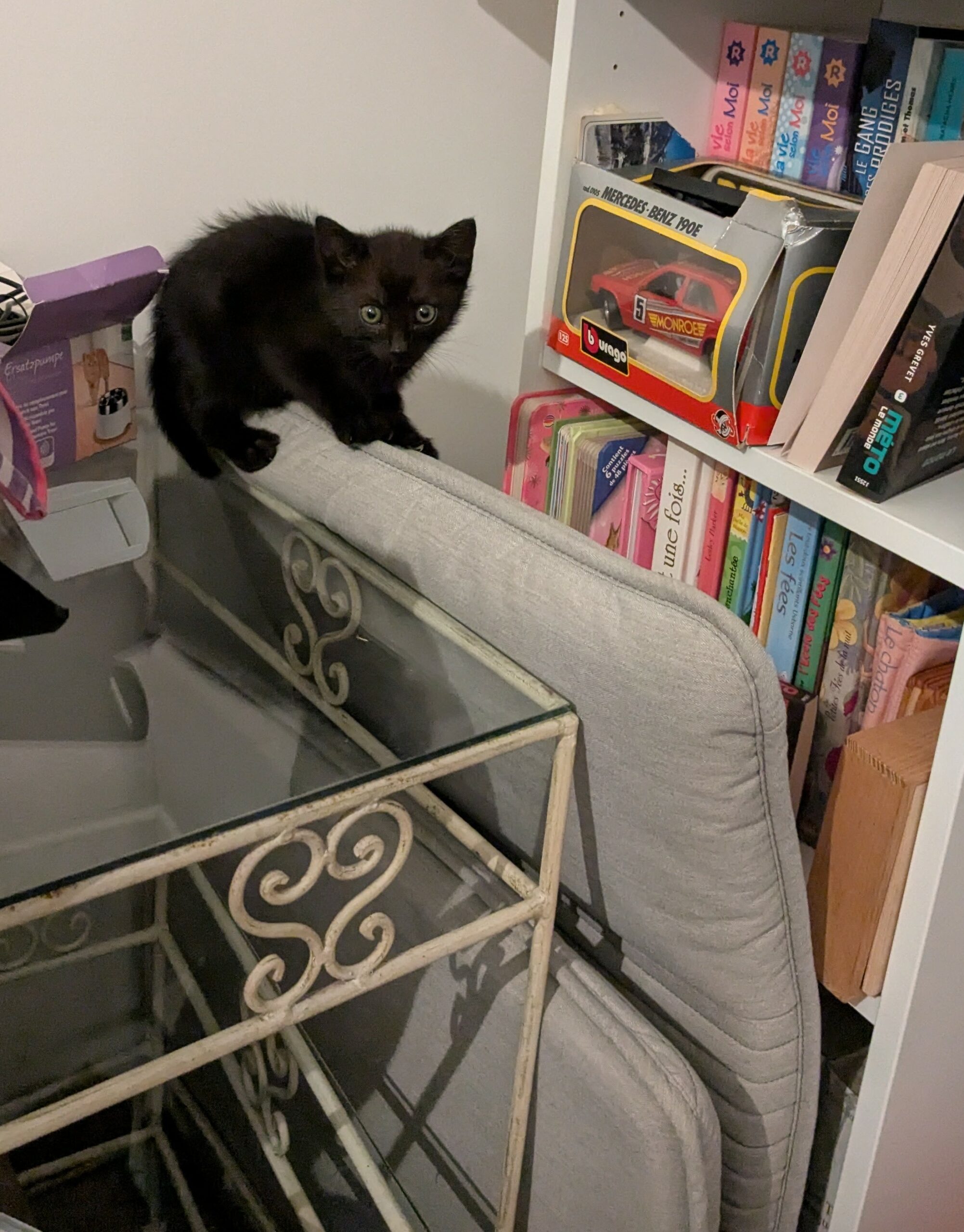 Mise en sécurité rapidement, elle est arrivée toute timide, ne semblant pas connaitre le confort d’une maison. Elle a dormi à même le sol les premiers jours, avant de se rendre compte que le coussin serait plus confortable, et plus longtemps encore avant d’oser monter sur le canapé.