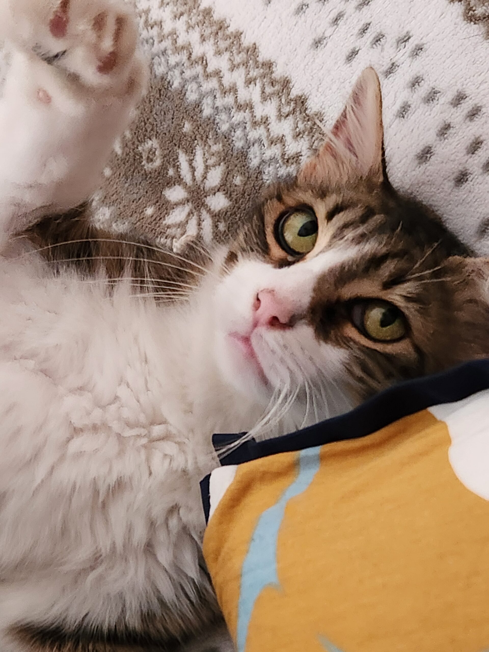 Elle est très câline et elle ronronne beaucoup. Elle est aussi très gourmande c’est la première pour terminer vos pots de yaourt et s’en mettre plein la truffe jusqu’aux oreilles.  Elle vient toujours se réchauffer dans les bras de ses humains.