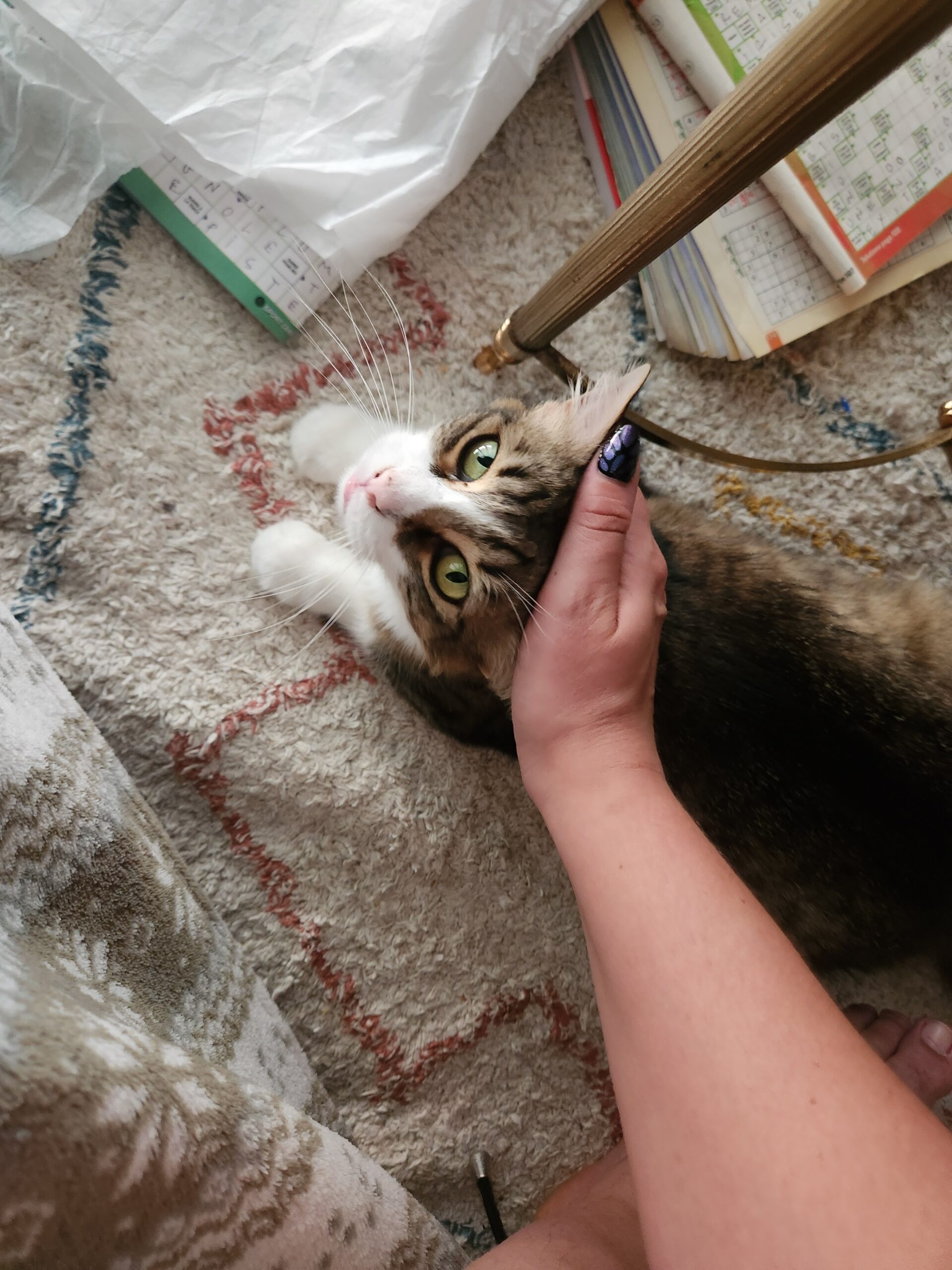 Elle est pour l’instant encore un peu craintive, mais se laisse régulièrement caresser et au passage apprécie me léchouiller les mains (et les pieds !).