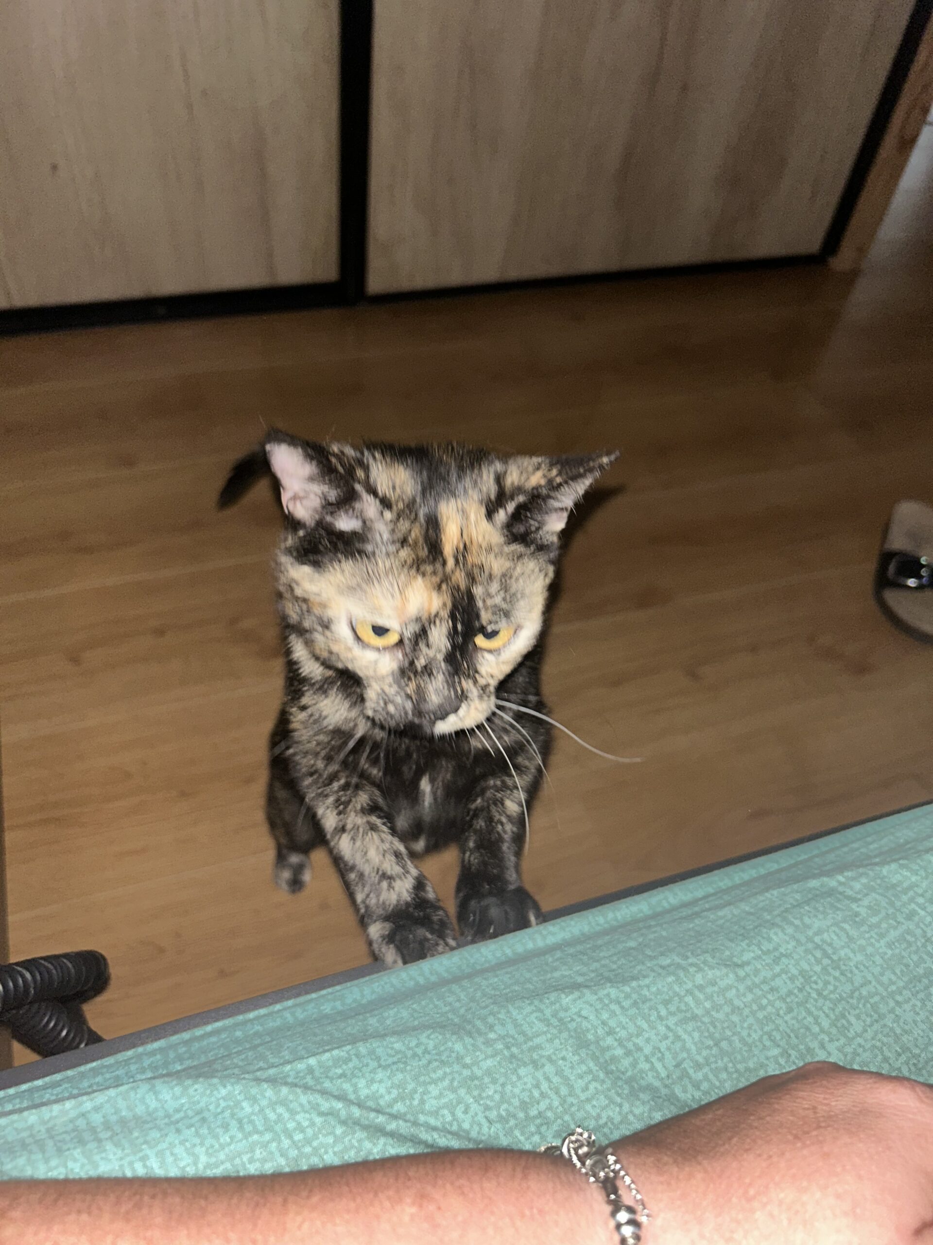 Elle est assez calme, contrairement à pas mal de chats ce n’est pas une « grimpeuse » (en tout cas pour l’instant !).