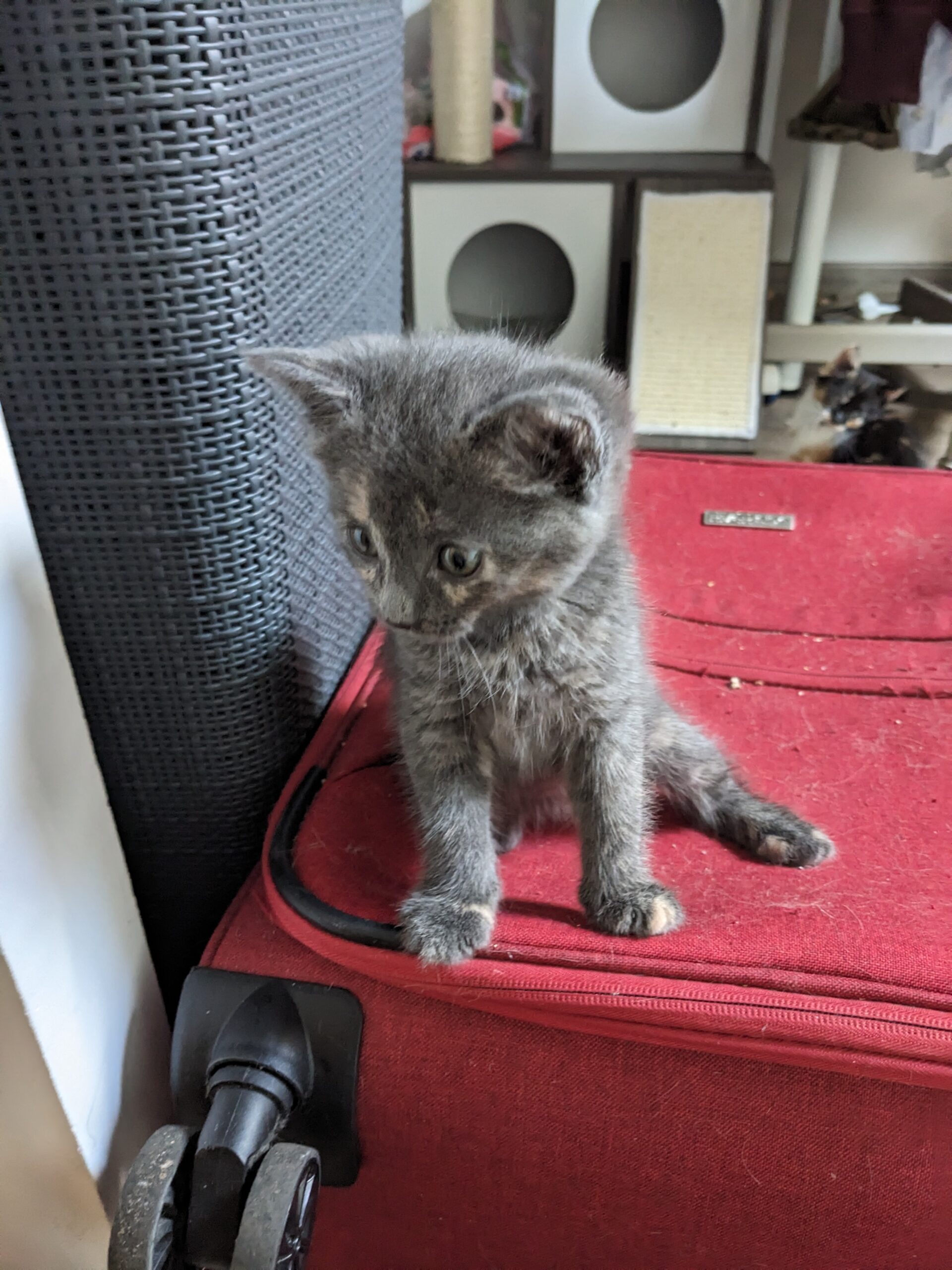 Gipsy est une jeune femelle , écaille de tortue qui est née  approximativement  autour du 1er octobre 2024. Elle a été trappée avec ses 3 chatons .