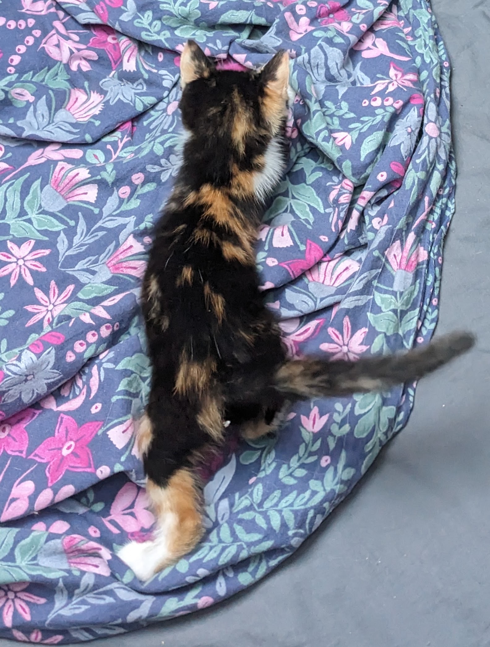 Gipsy est une jeune femelle , écaille de tortue qui est née  approximativement  autour du 1er octobre 2024. Elle a été trappée avec ses 3 chatons .