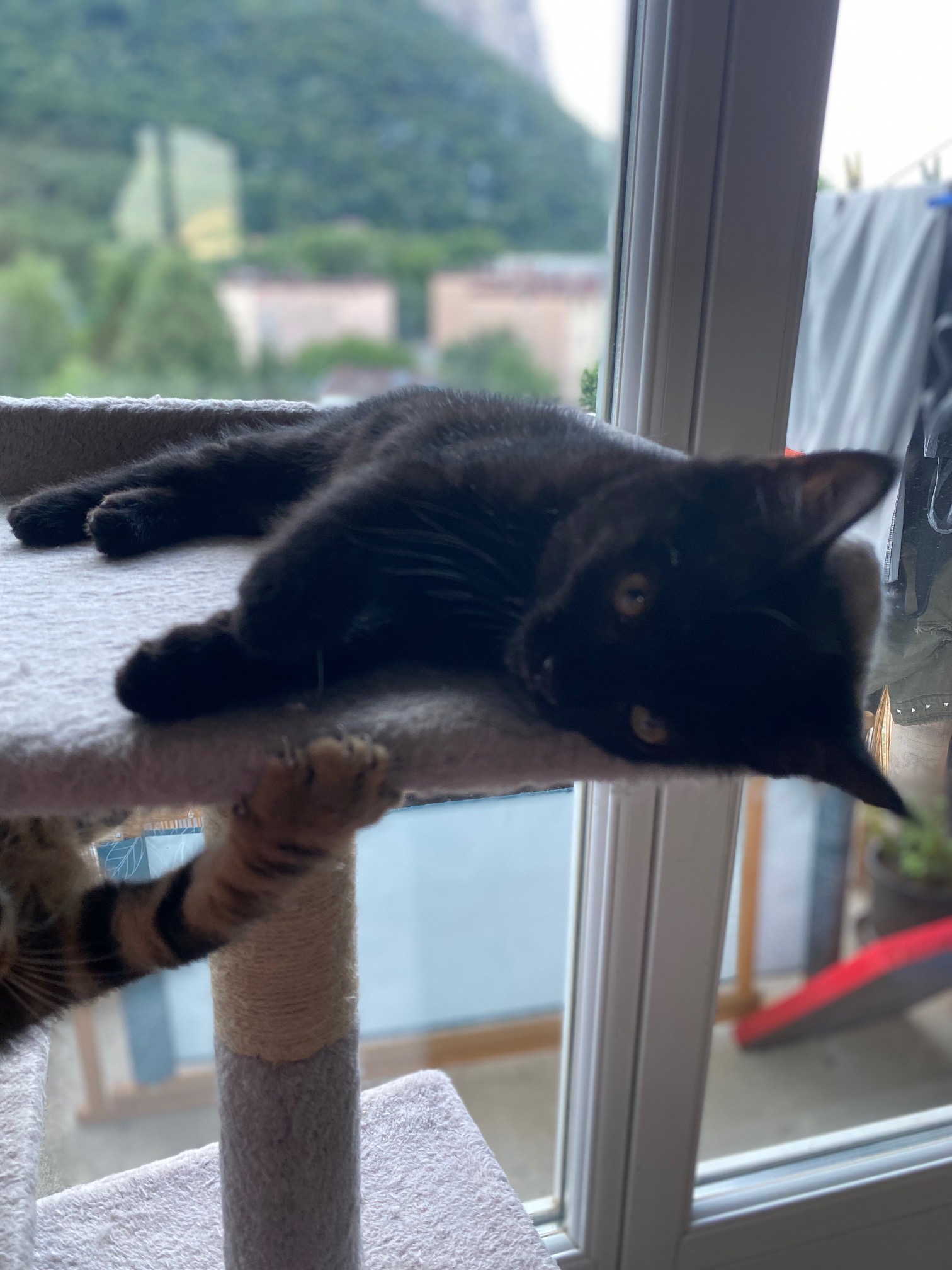 Elle est assez calme, contrairement à pas mal de chats ce n’est pas une « grimpeuse » (en tout cas pour l’instant !).