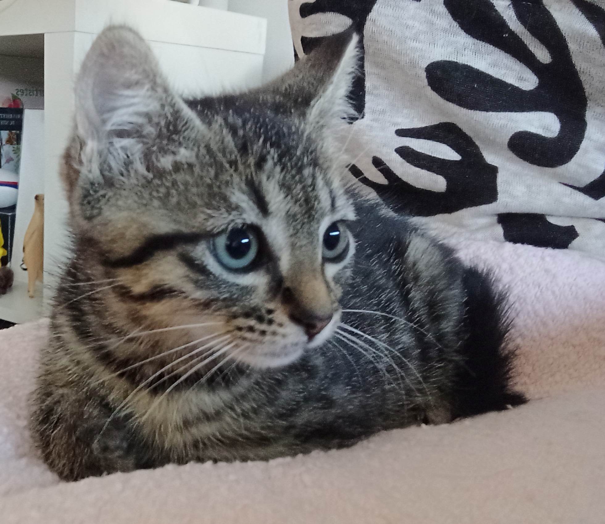 Très jolie frimousse, très peureuse (au début), très câline après, Sheba n’aime pas rester dans un coin seule.