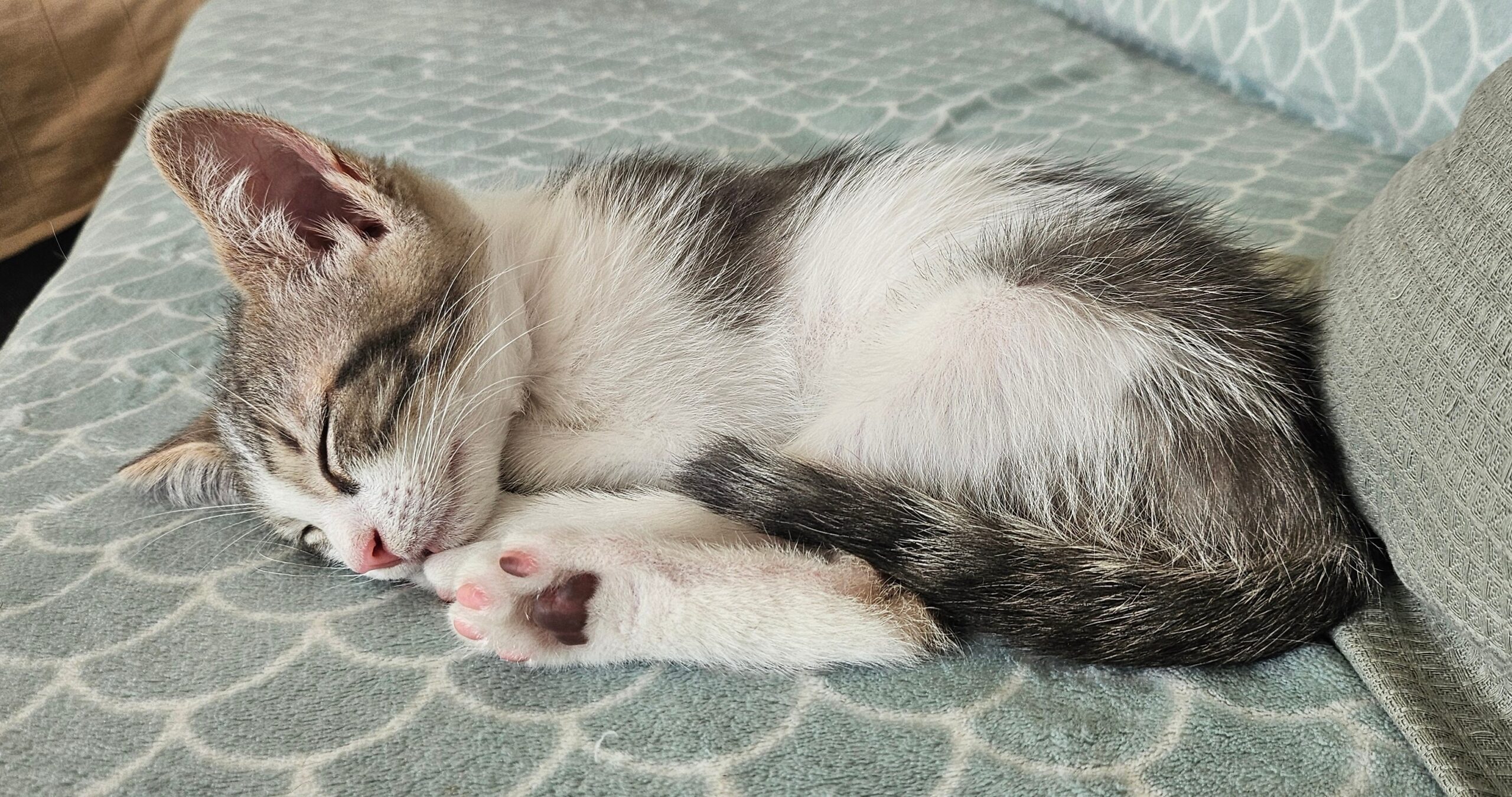 Il a depuis été adopté et mène une vie de câlins et de bonheur avec un copain chat et sa famille d’adoption.