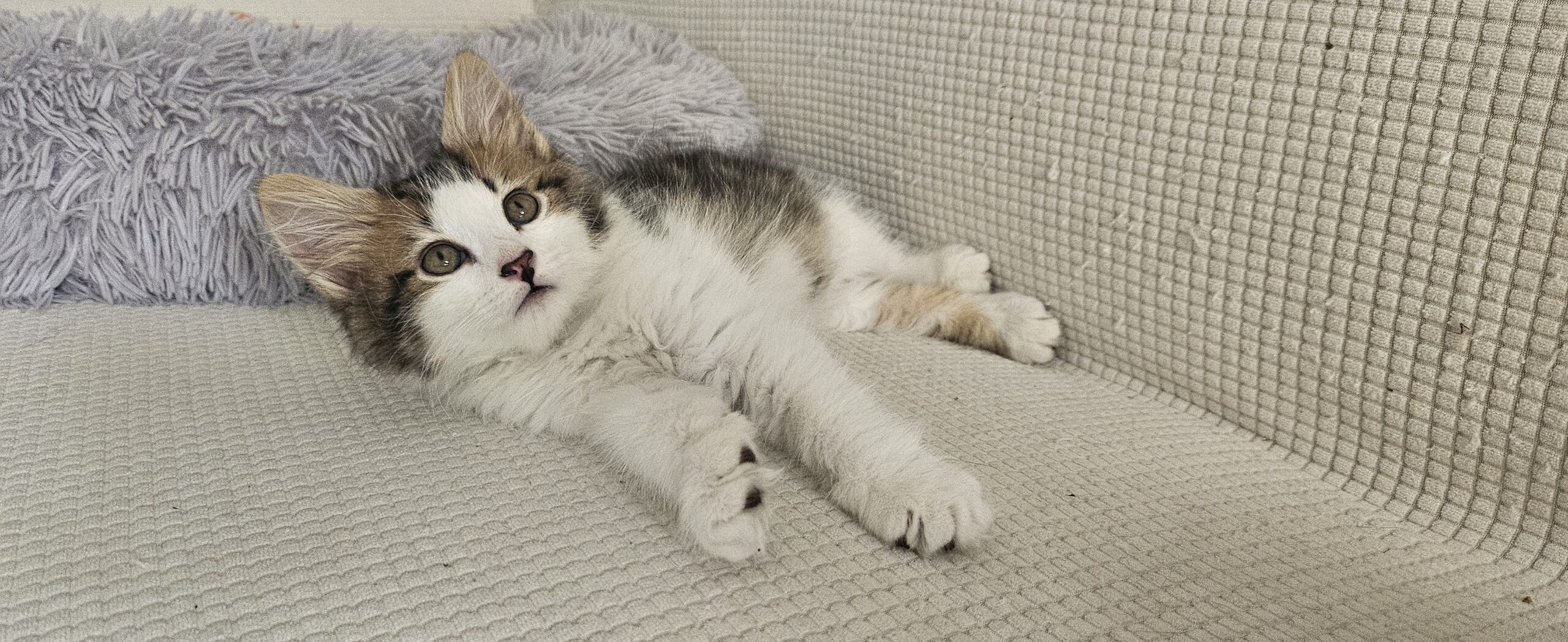 Mise en sécurité rapidement, elle est arrivée toute timide, ne semblant pas connaitre le confort d’une maison. Elle a dormi à même le sol les premiers jours, avant de se rendre compte que le coussin serait plus confortable, et plus longtemps encore avant d’oser monter sur le canapé.