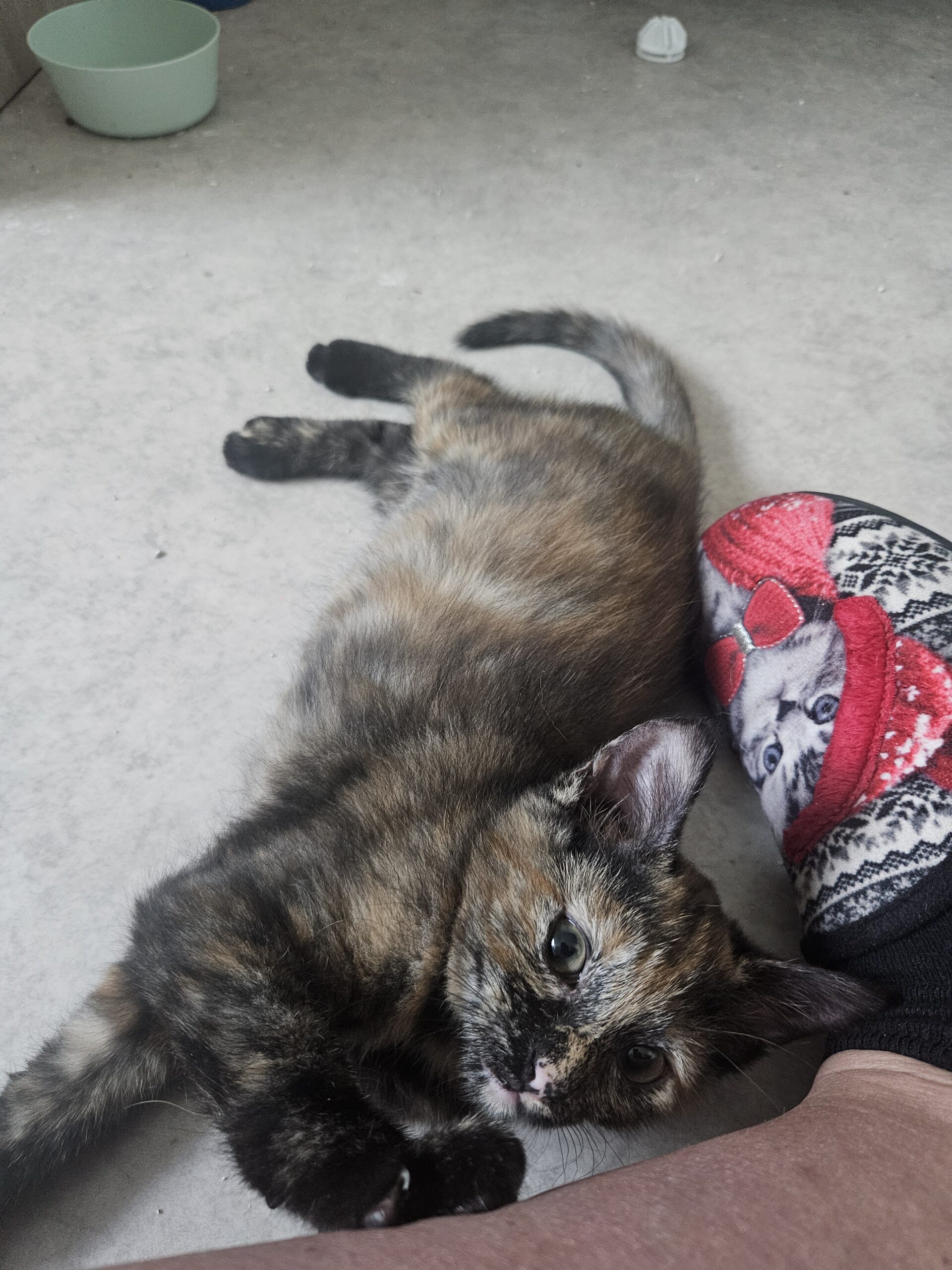 Gipsy est une jeune femelle , écaille de tortue qui est née  approximativement  autour du 1er octobre 2024. Elle a été trappée avec ses 3 chatons .