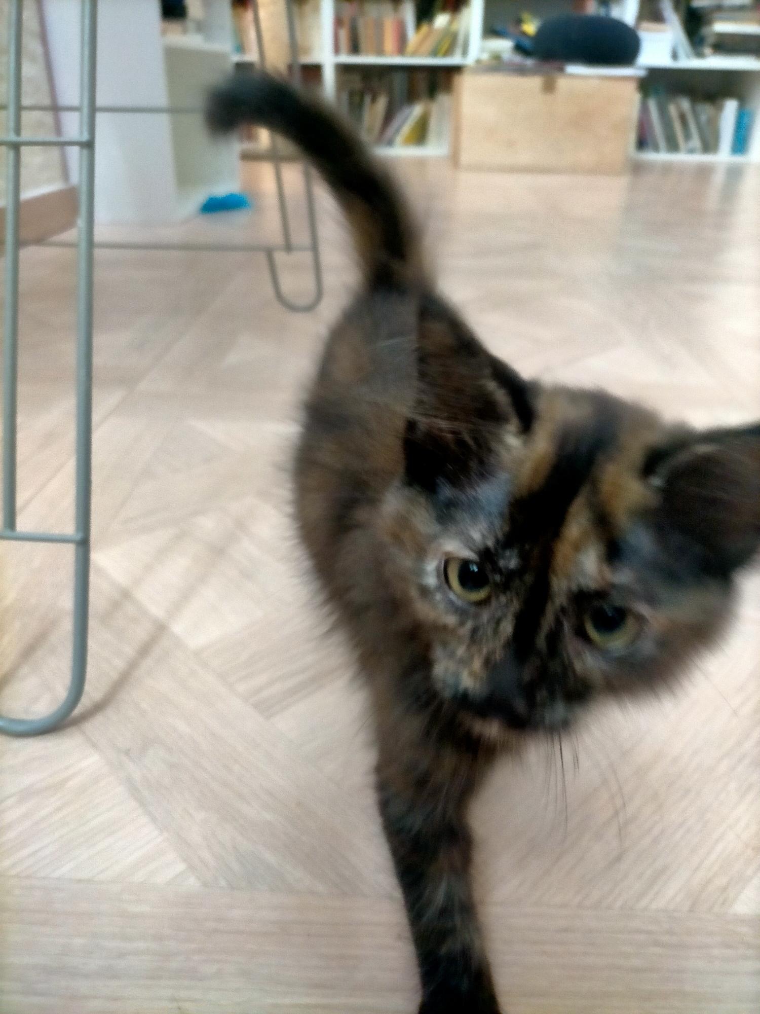 Elle est pour l’instant encore un peu craintive, mais se laisse régulièrement caresser et au passage apprécie me léchouiller les mains (et les pieds !).