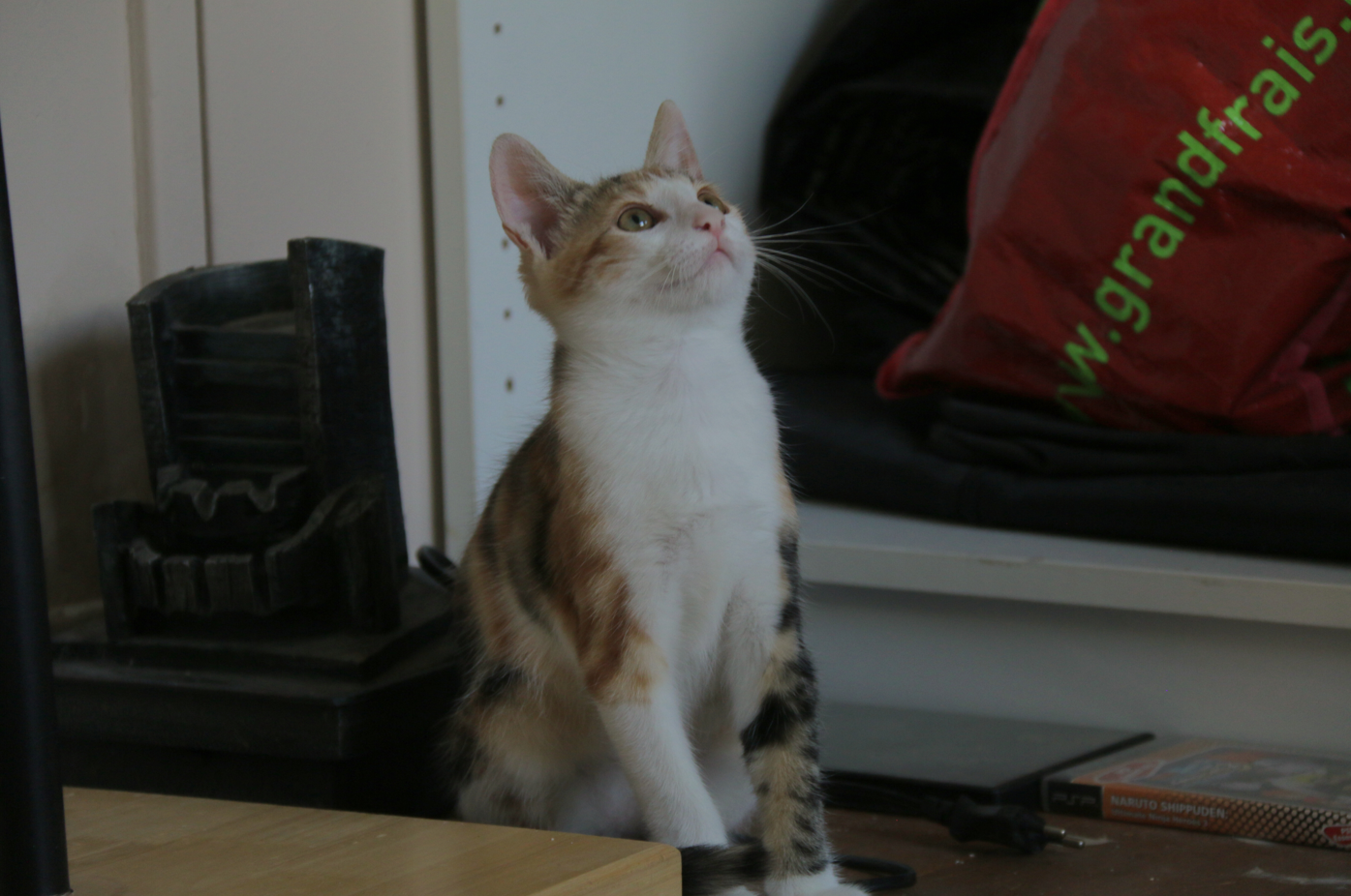 Maintenant qu’elle a confiance, c’est un amour, elle ronronne et vient chercher les câlins.  Par contre  se méfier, quand on lui donne sa pâtée, ayant sûrement endurée la faim, on peut se prendre quelques coup de pâte.  C’est  pour ça  que je conseille d’éviter les enfants en bas âge.
