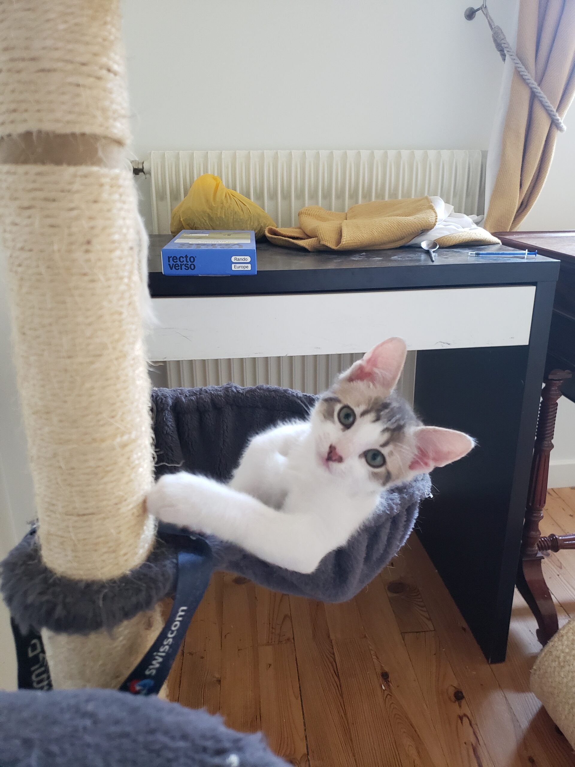 La plupart du temps, Panghu aime dormir tranquillement. Ce n’est pas un chat hyperactif, il est plutôt posé et calme. Il ne fait pas de bêtises, ne court pas partout. C’est un compagnon discret et rassurant.