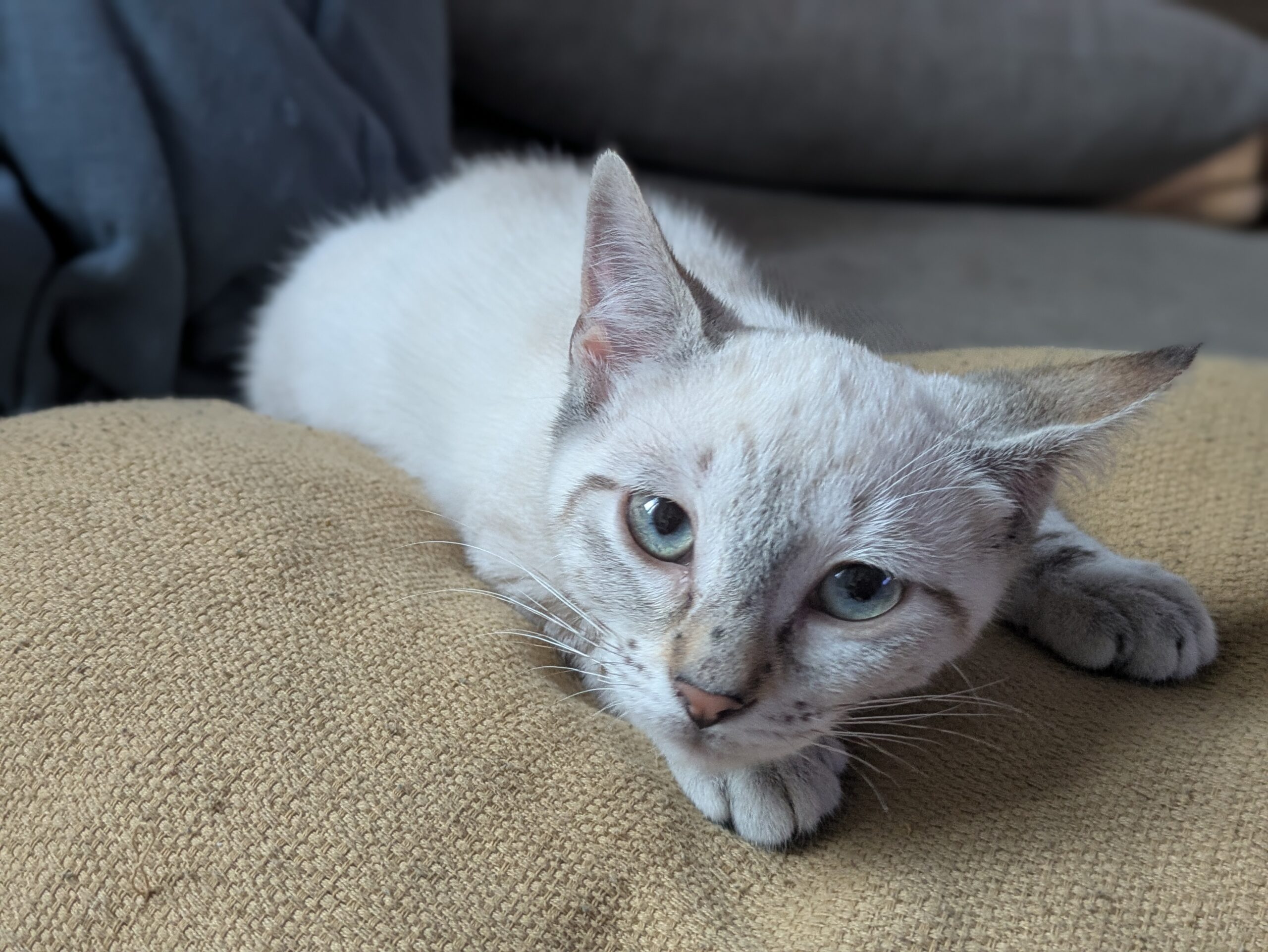 Après une petite semaine « choc » assez stressante pour elle et sa sœur pour s’habituer à la vie en intérieur et au contact répété avec les humains, Nuage a pris confiance en l’homme (et en la vie en appartement !).