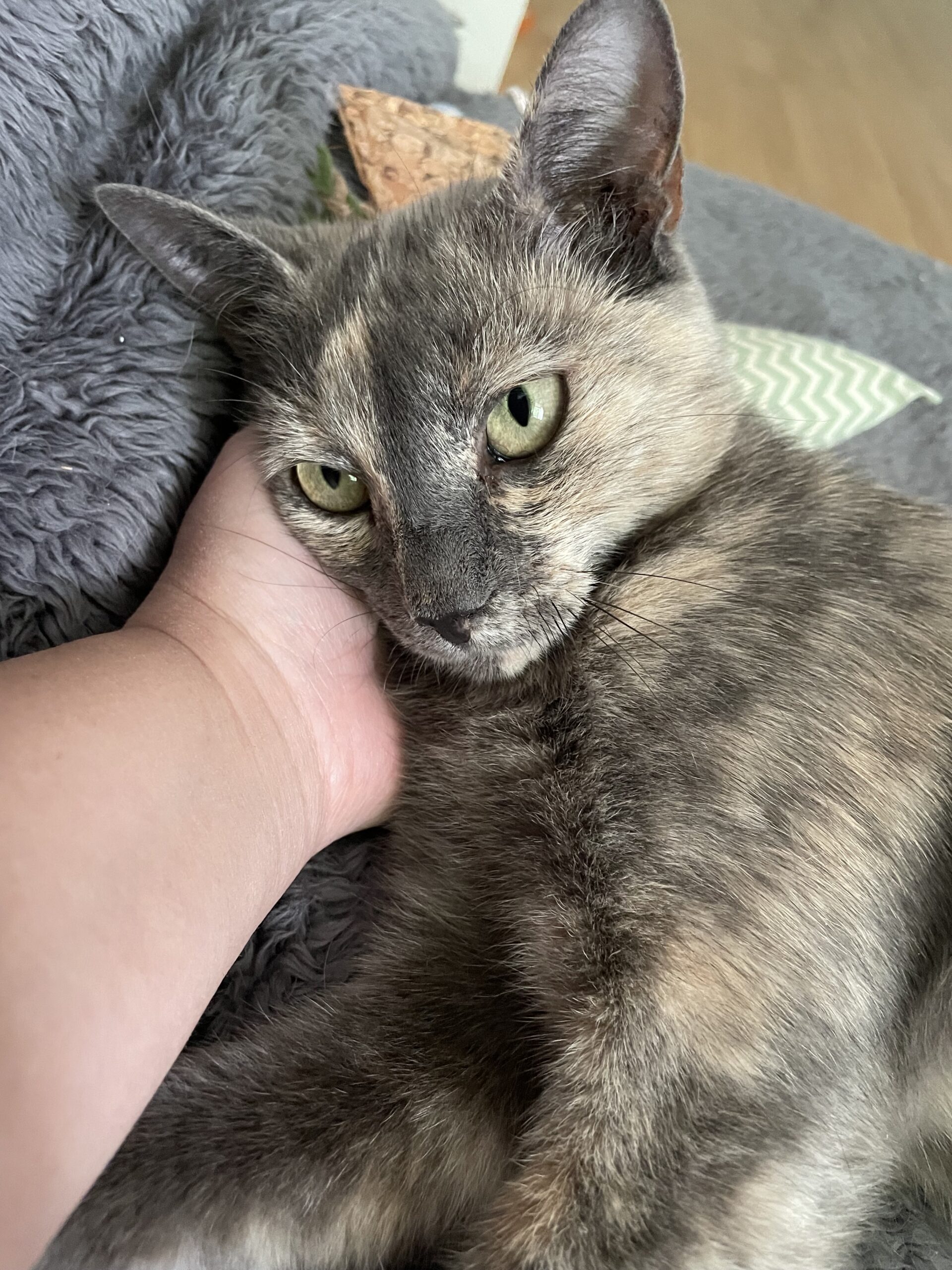 Noumy est une chatte d’un an au pelage écaille de tortue.