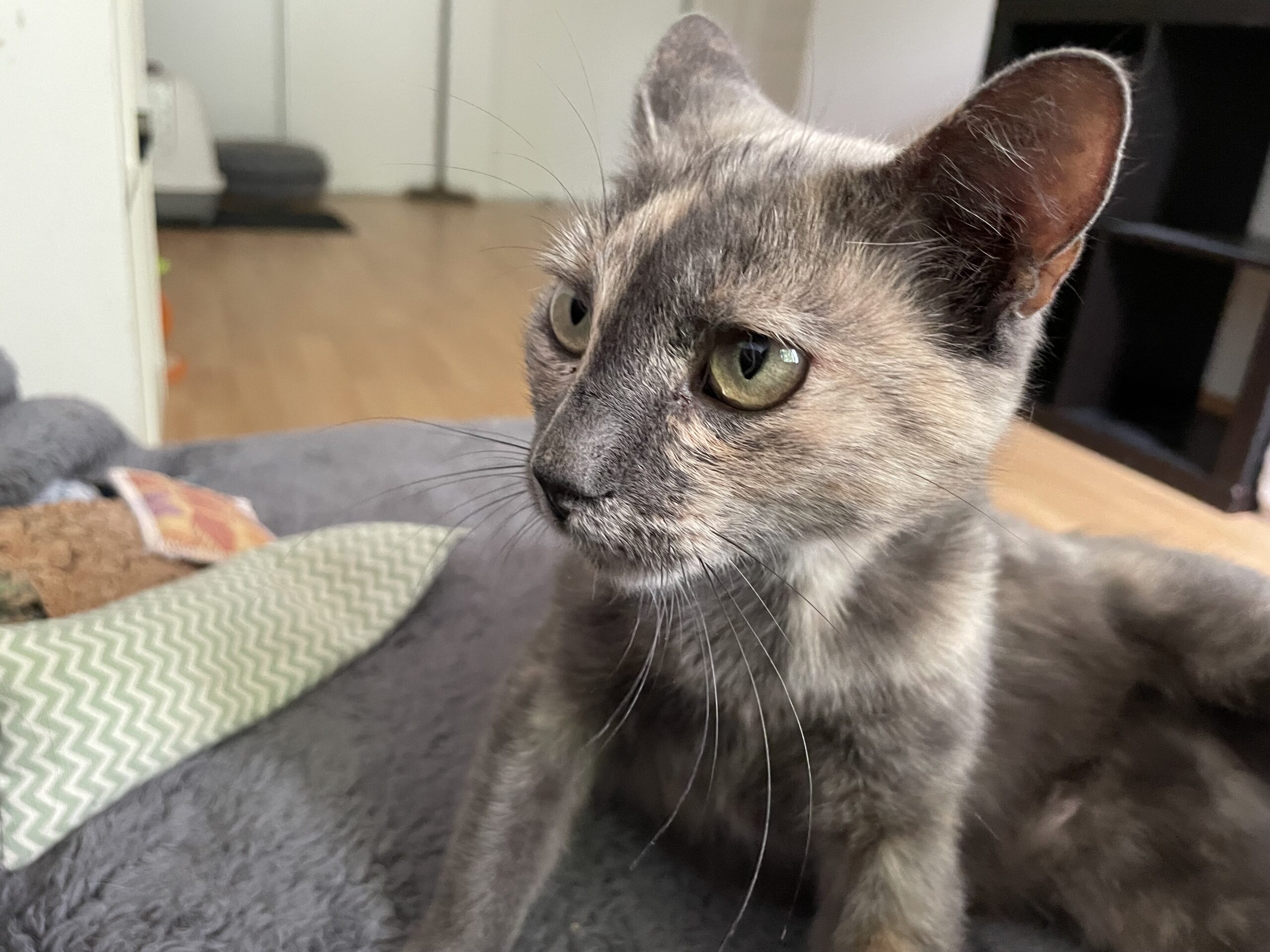 J'ai eu la chance d'adopter ce petit bout qui avait un énorme retard de croissance. Chaque jour après l'adoption je la pesais et avec sa famille d'accueil nous nous réjouissions de ses progrès. Yoko a petit à petit pris du poids. A 8 mois elle a enfin décidé de manger des croquettes qu'elle boudait jusqu'alors. Elle a pris son temps... lentement mais sûrement! Elle reste petite aujourd'hui mais tellement rigolote ! C'est ce qui fait son charme ! Mon mini chat ! Ma petite écaille de tortue qui illumine l'appartement par son caractère attachant. Elle peut être très pot de colle au point qu'il est désormais impossible d'aller dans une pièce sans être suivie, y compris les toilettes ! Alors que parfois, elle n'a pas envie d'être sociable et tourne ostensiblement la tête dans une autre direction quand on s'approche pour des câlins. Elle sait ce qu'elle veut !
