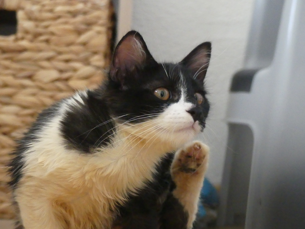 Elle est pour l’instant encore un peu craintive, mais se laisse régulièrement caresser et au passage apprécie me léchouiller les mains (et les pieds !).