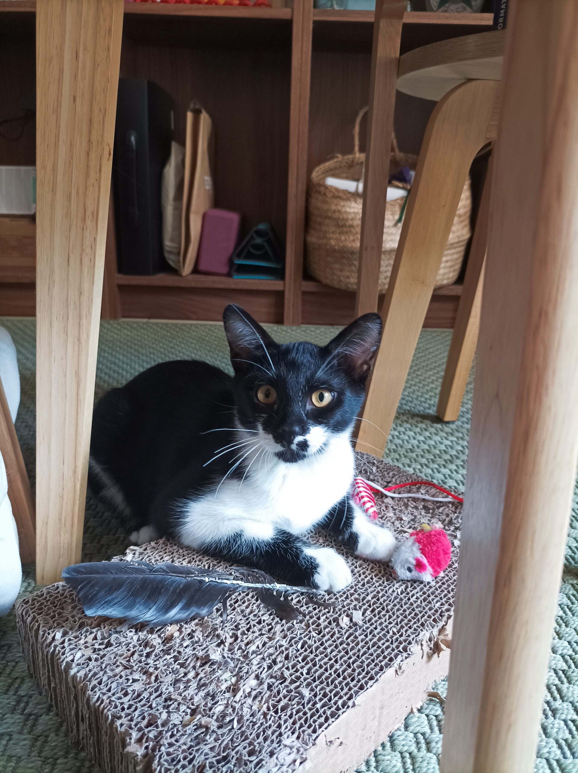 Elle est assez calme, contrairement à pas mal de chats ce n’est pas une « grimpeuse » (en tout cas pour l’instant !).