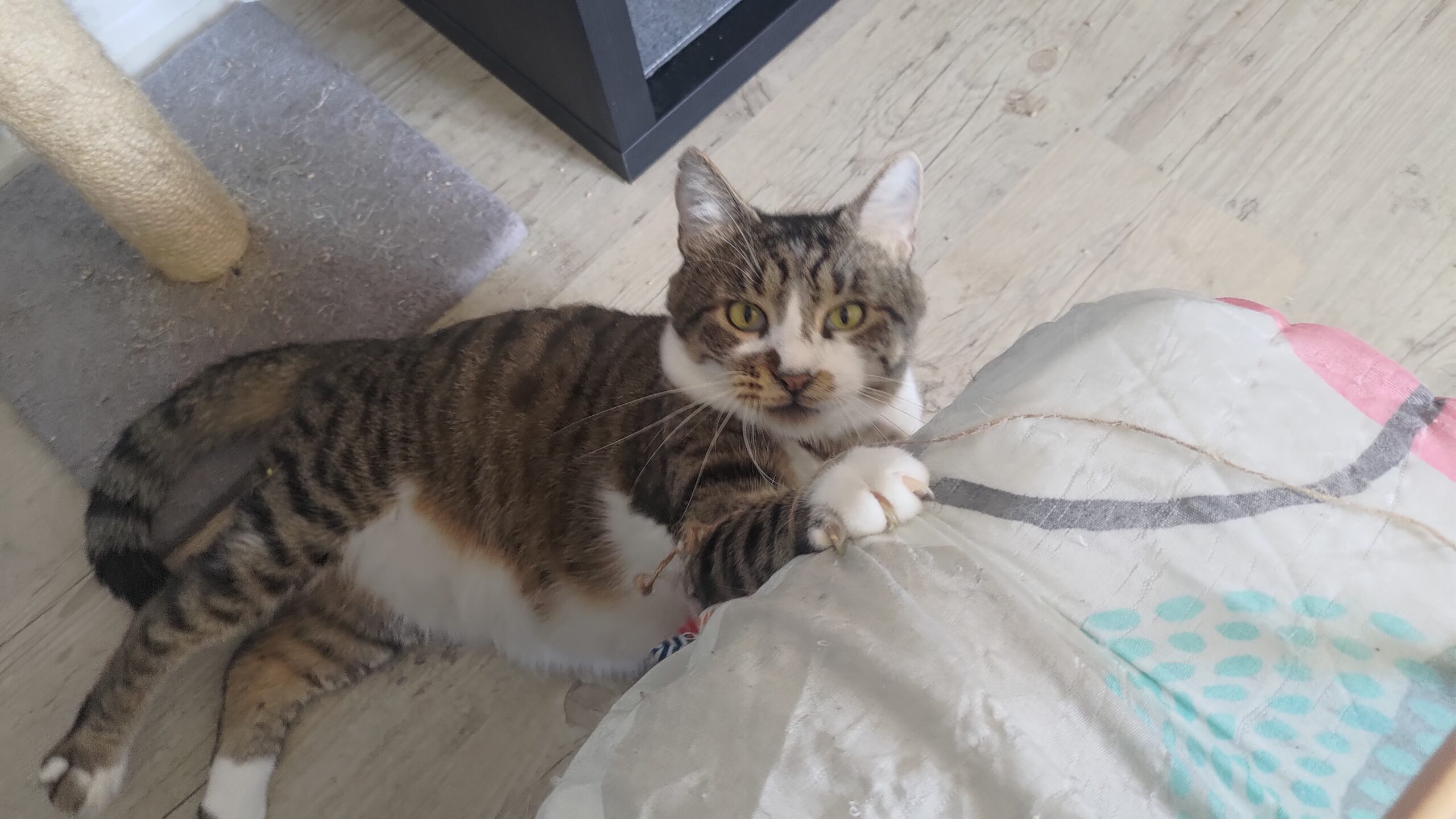 Elle est assez calme, contrairement à pas mal de chats ce n’est pas une « grimpeuse » (en tout cas pour l’instant !).