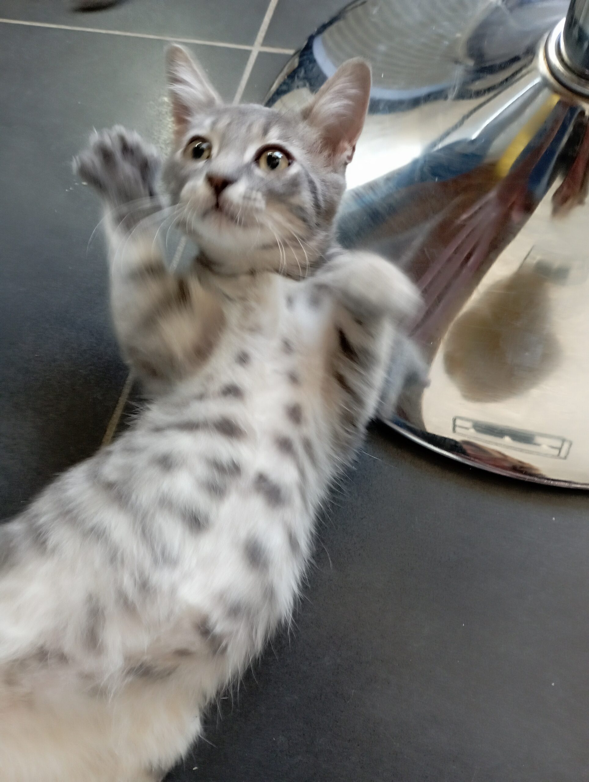 Je suis un grand peureux, mais une fois ma confiance gagnée vous ne pourrez plus rien voir d’autre que tout l’amour et les léchouilles que j’ai à donner, je suis un vrai pot de colle et je fais savoir quand j’ai besoin d’attention en miaulant pour qu’on vienne me voir