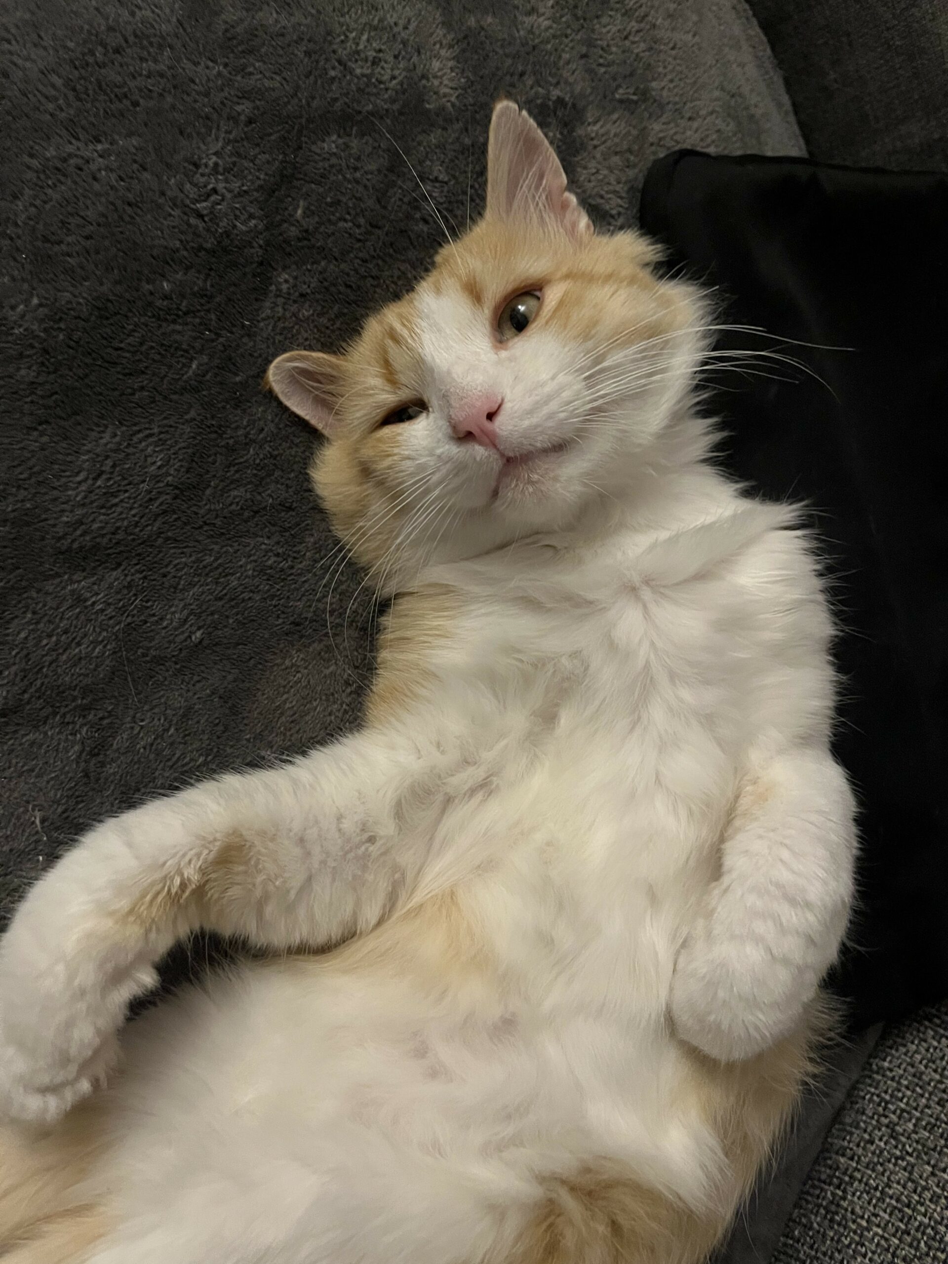 Je suis un grand peureux, mais une fois ma confiance gagnée vous ne pourrez plus rien voir d’autre que tout l’amour et les léchouilles que j’ai à donner, je suis un vrai pot de colle et je fais savoir quand j’ai besoin d’attention en miaulant pour qu’on vienne me voir